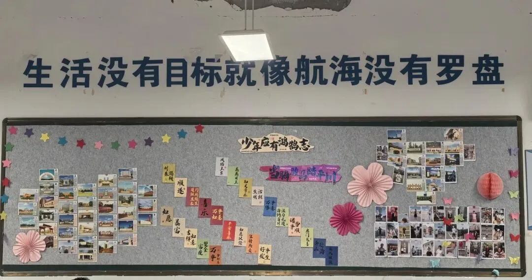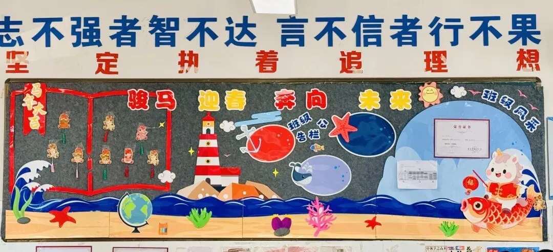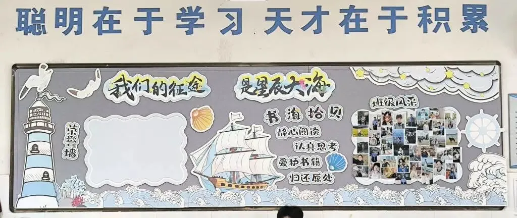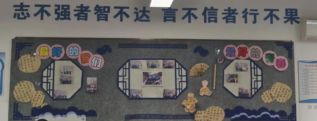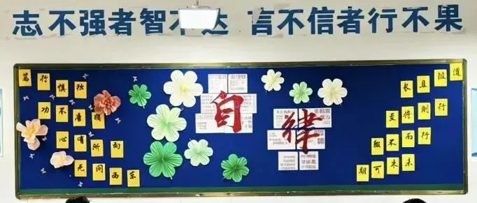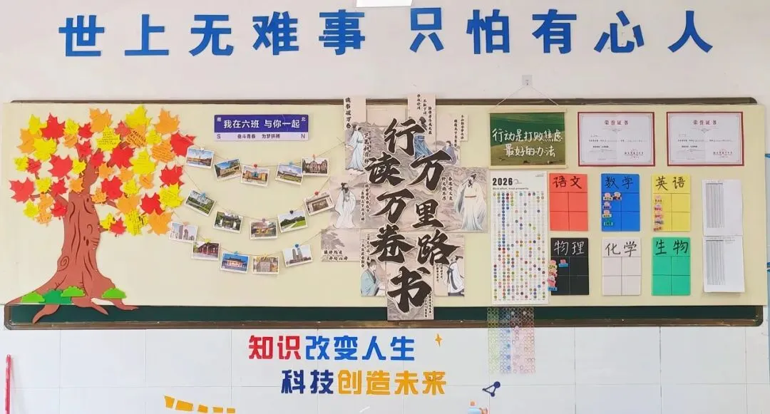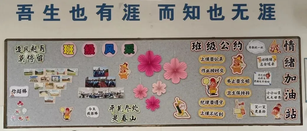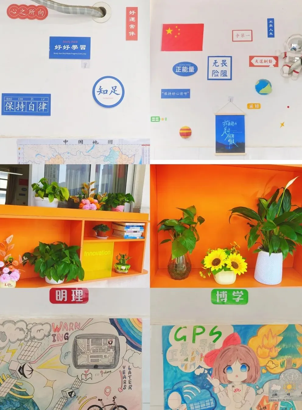 为营造知行合一、勤学善思、视野开阔的班级氛围,我们以“步履远方·静心治学”为主题打造文化墙,分三大板块: