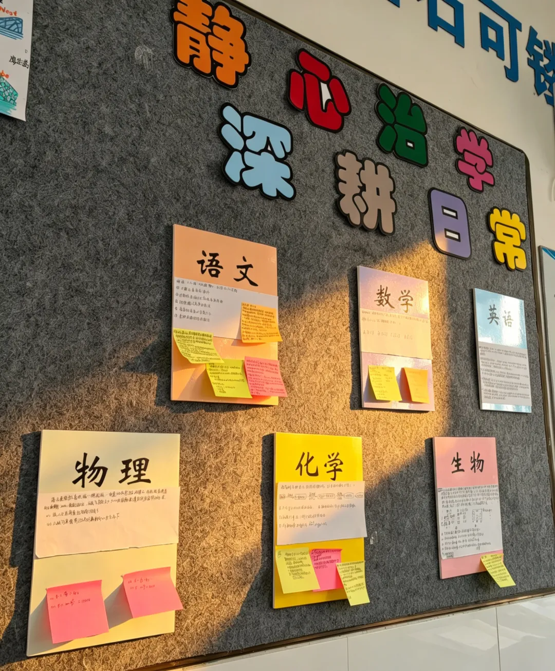 右侧“静心治学 深耕日常”区,按语数英等六大学科设置好题分享专区,预留便利贴互动区,让文化墙成为动态交流阵地,营造互助共进的学风。