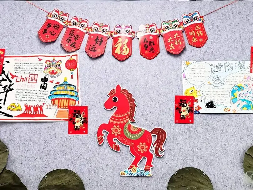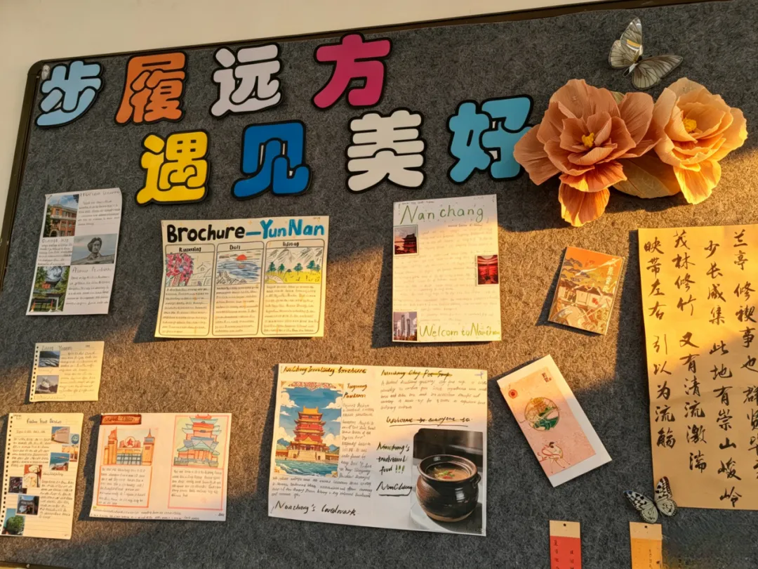 左侧“步履远方 遇见美好”区,展示同学们假期研学、旅行的手抄报与英文报告,搭配书法、纸花等装饰,鼓励大家走出课堂、拓宽视野,在行走中丰盈内心。