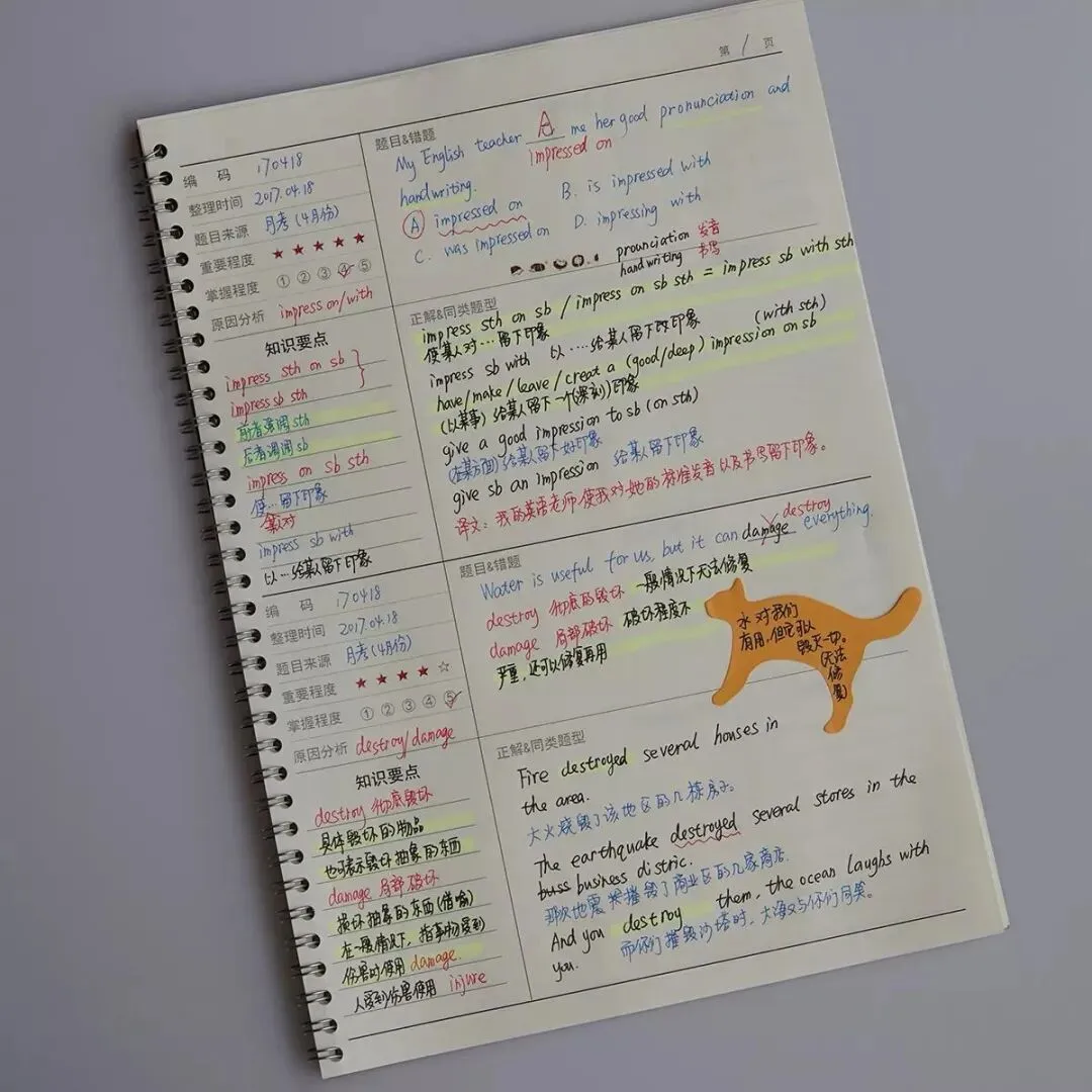 这类孩子上课全程盯着笔记本,老师说一句记一句,黑板写一行抄一行,笔记做得密密麻麻,各种颜色标注堆砌在一起。