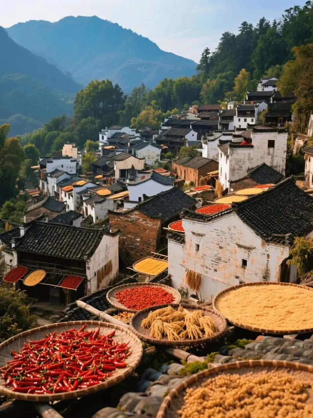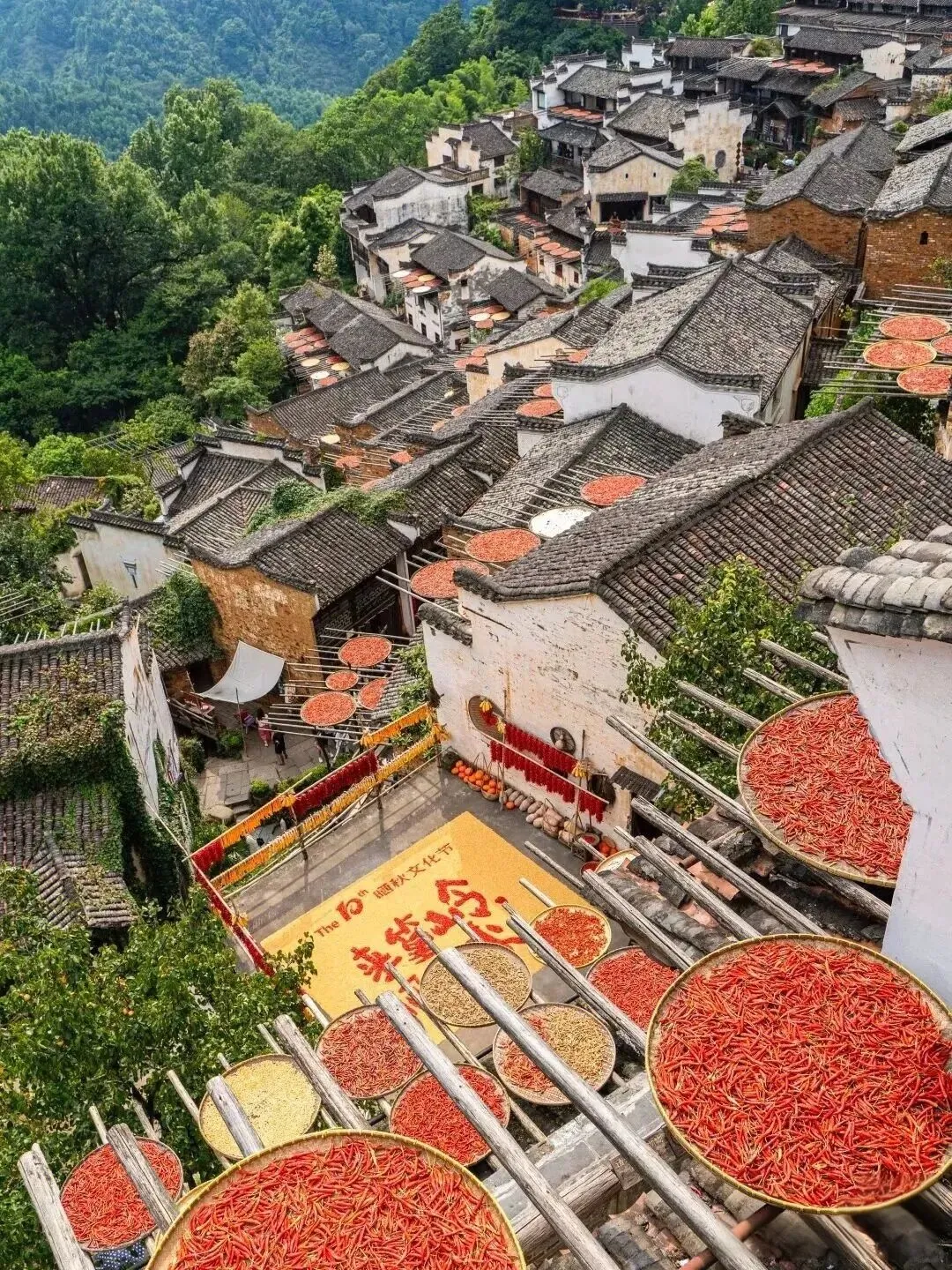 乘索道登上篁岭古村落,俯瞰梯云村落、天街古巷。漫步白墙黛瓦间,打卡最美观景台,看火红辣椒、金黄皇菊在竹匾中铺展,绘就最绚丽的丰收画卷。徽派老宅、祠堂牌坊静立时光里,每一步都是画中游。