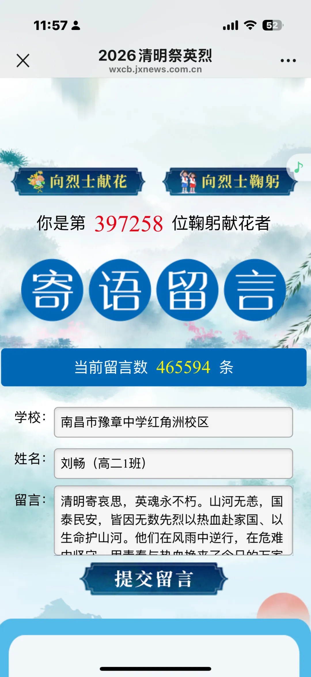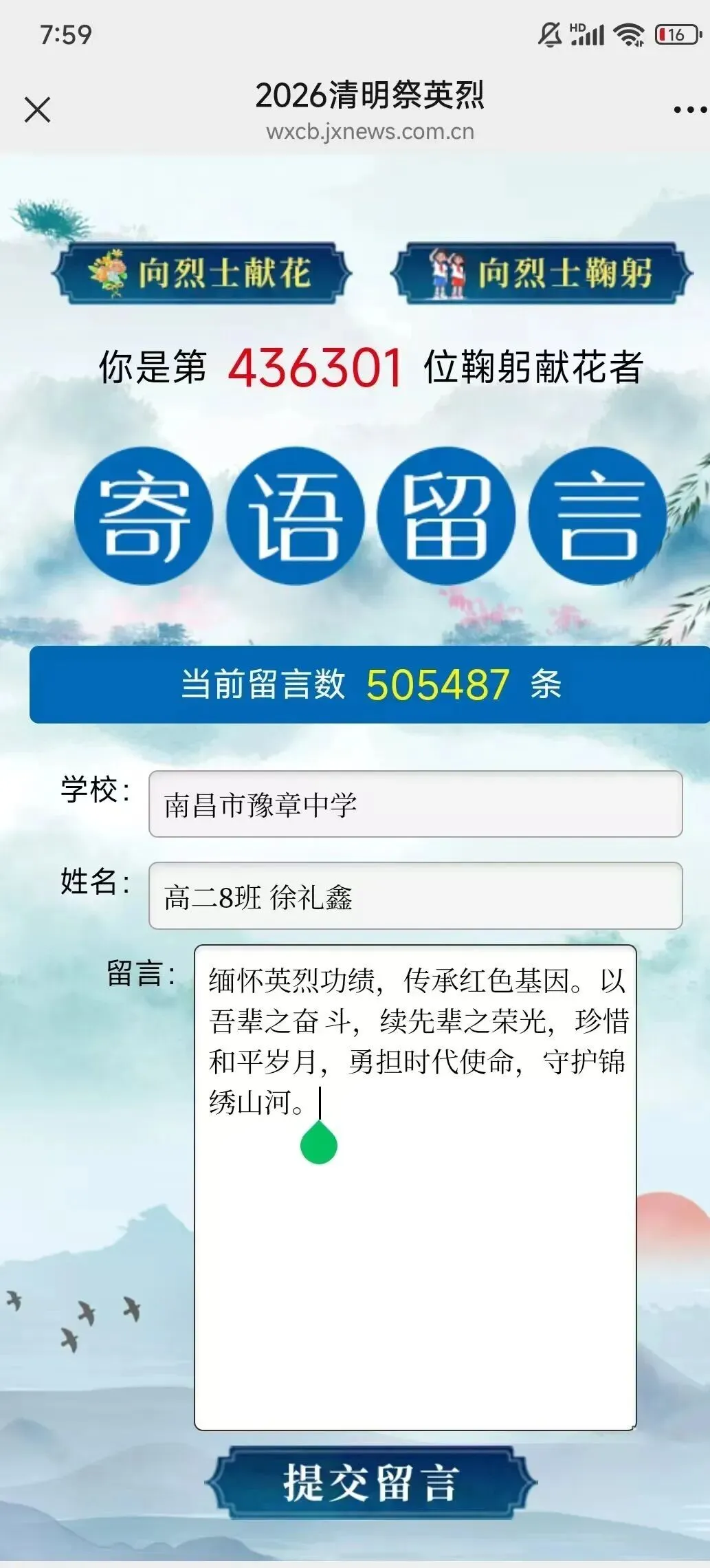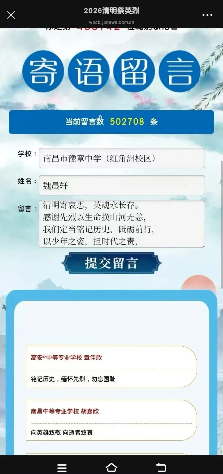 我校还积极组织全体学生参与文明江西网上祭英烈主题活动。同学们怀着崇敬之心,通过云端献花、书写寄语等方式,深切缅怀革命先烈,传承红色基因。大家发自内心追思英雄事迹,厚植爱国情怀,以青春之名致敬英烈,立志传承先辈精神,争做担当有责任感的时代新人。