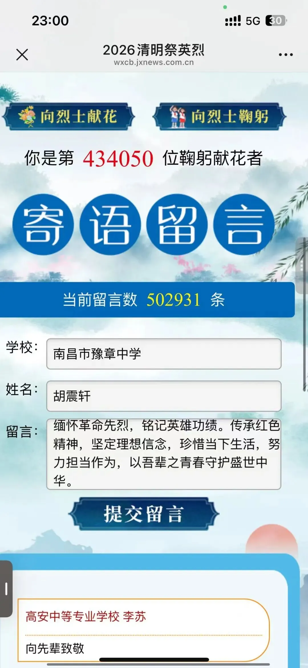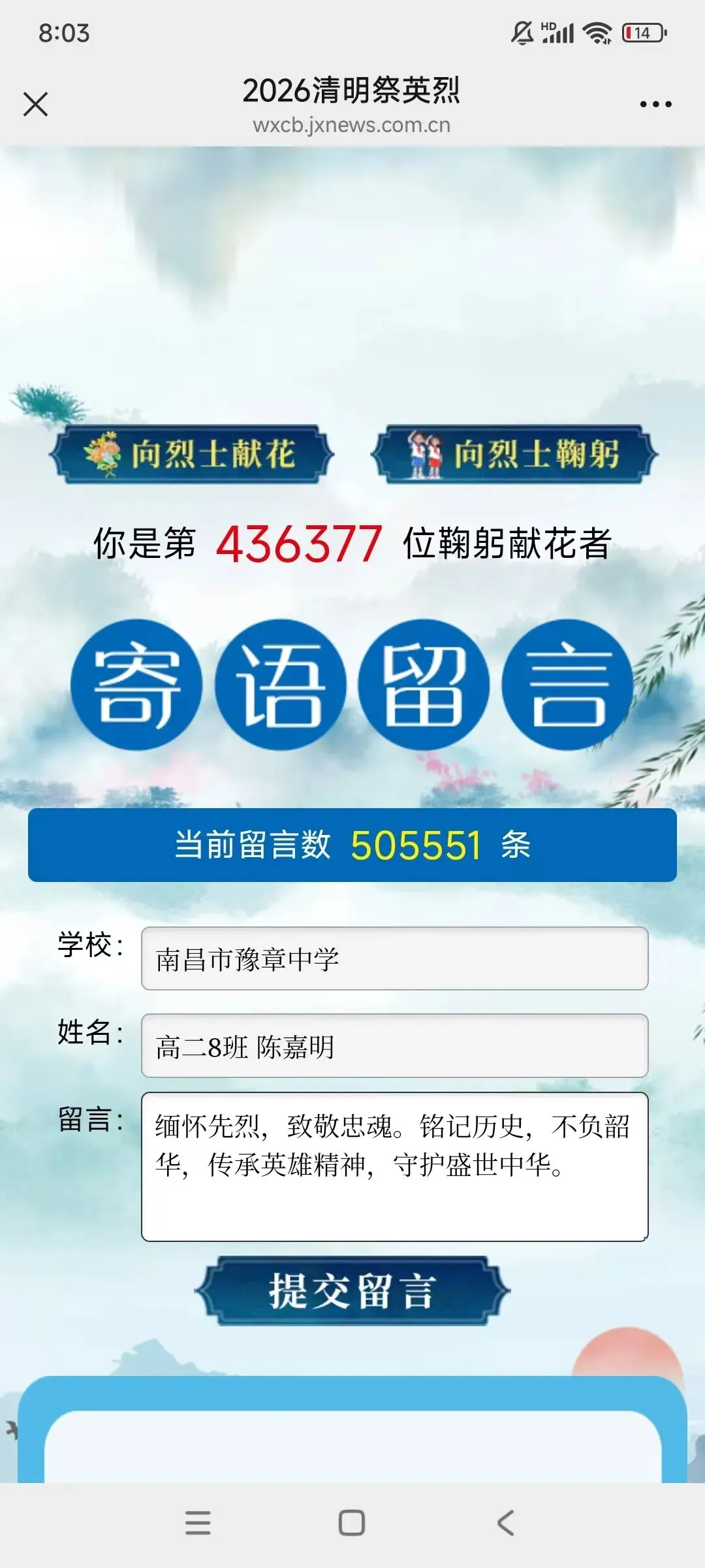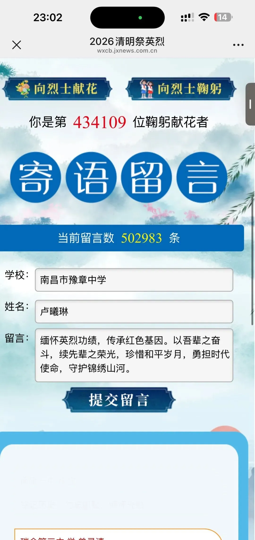 我校还积极组织全体学生参与文明江西网上祭英烈主题活动。同学们怀着崇敬之心,通过云端献花、书写寄语等方式,深切缅怀革命先烈,传承红色基因。大家发自内心追思英雄事迹,厚植爱国情怀,以青春之名致敬英烈,立志传承先辈精神,争做担当有责任感的时代新人。