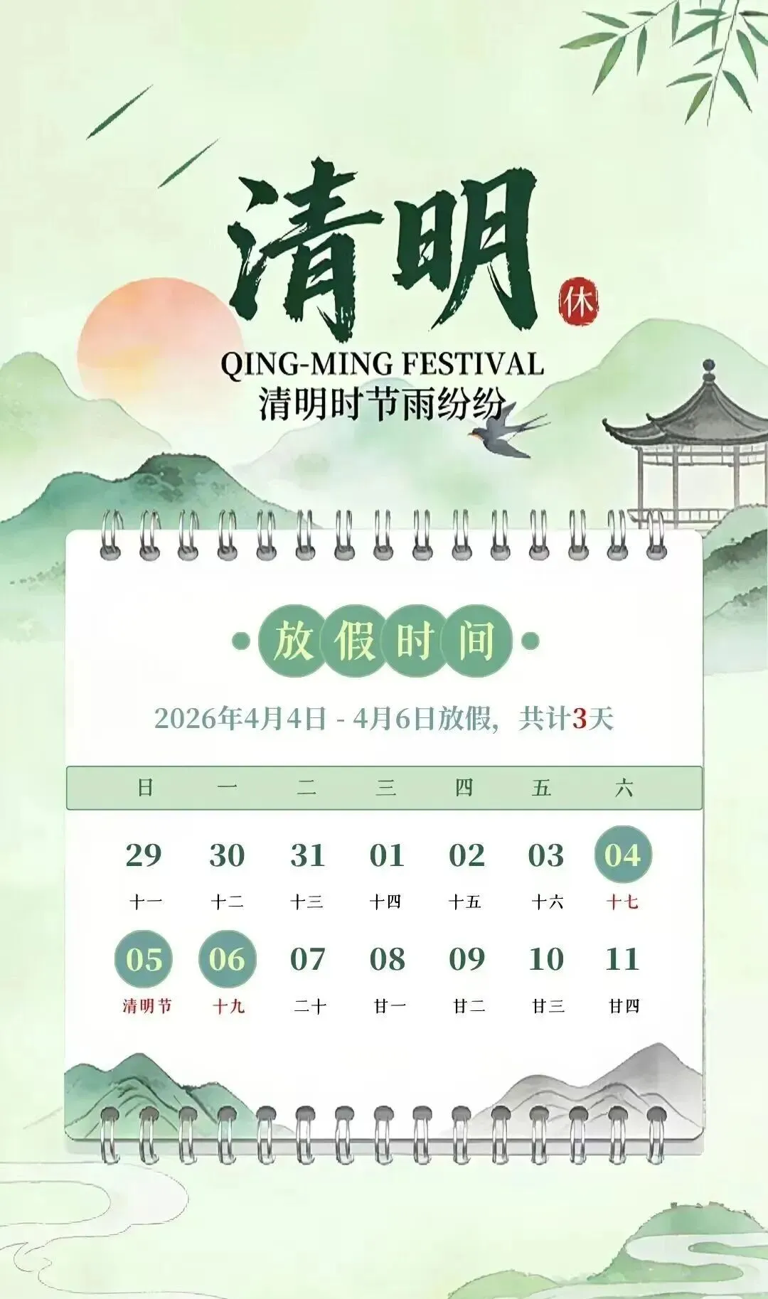 2026年清明节放假安排:4月4日至4月6日放假,共3天。