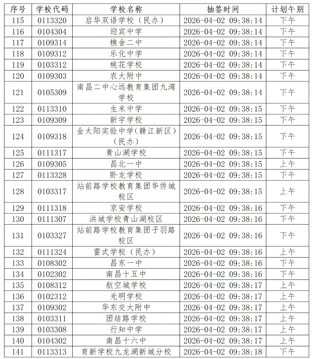 备注:复兴外国语学校和湾里的几所学校参加城区抽签上下午时 段考试仅指报考新增项目的考生。