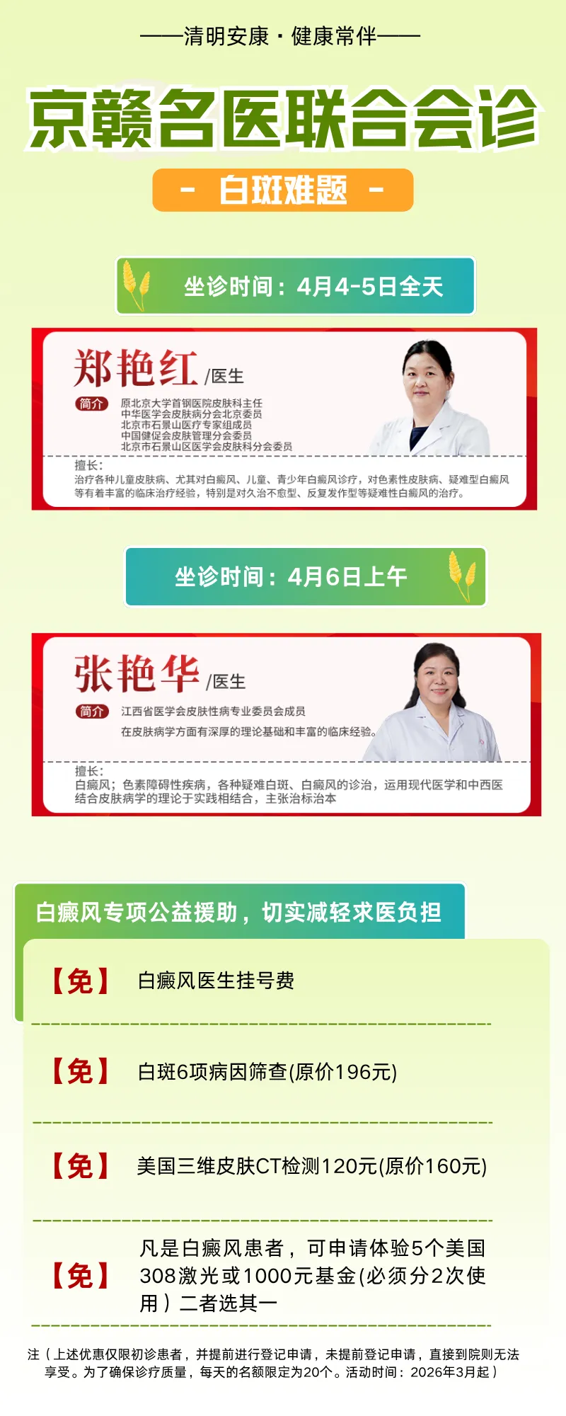清明时节、气清景明、正是调整身心,防治疾病的良机。我们诚挚邀请每一位受白癜风困扰的朋友,把握这次诊疗良机,从一次权威的会诊开始,播种复色的希望。祛白之约,不见不散!