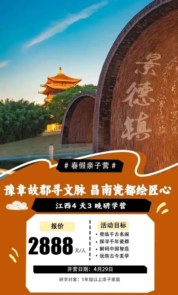 春假研学动车线:南昌+景德镇4日游,优惠价2888元,含动车丨从滕王阁到千年瓷都,诗瓷双绝…