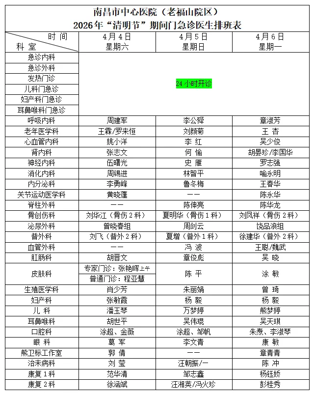 清明节假期期间,除以上科室开诊,其余科室均不开诊,如有就诊需求请前往其他医院就诊;