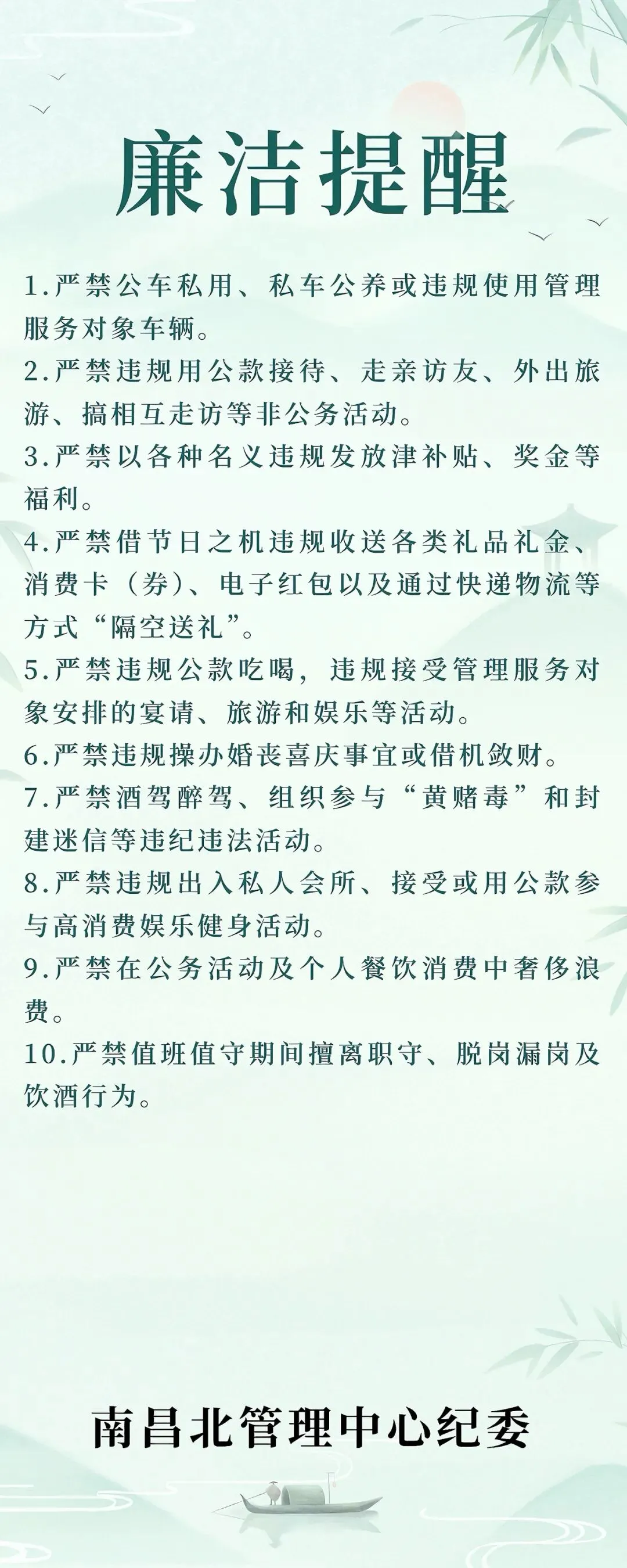 清风拂面,廉记心间。又是一年清明至,为进一步严明纪律、筑牢作风堤坝,严防“四风”问题反弹回潮,南昌北管理中心纪委提醒广大党员干部职工:追思当“明”礼,过节不失“节”,倡导文明祭扫新风,自觉践行“十个严禁”,让清明更“清明”,让廉风润心田。
