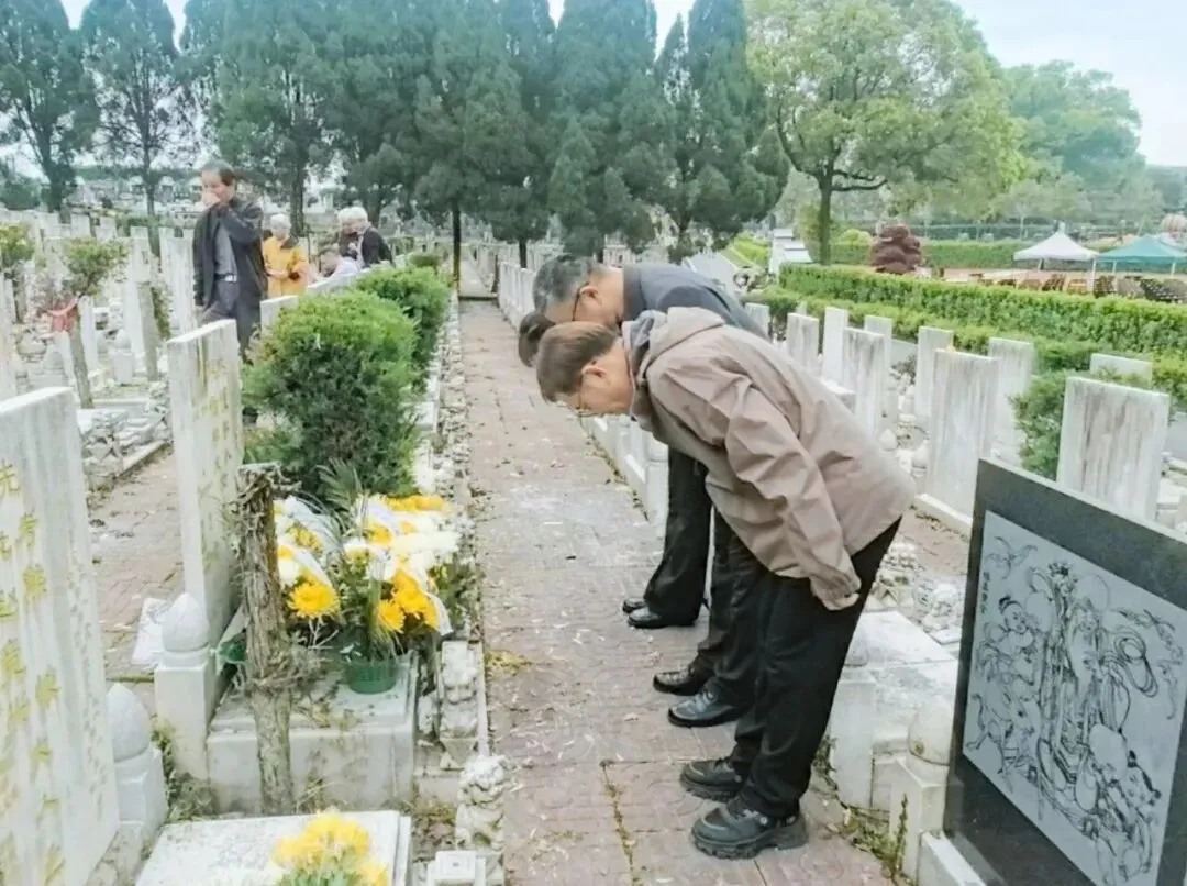 祭扫现场庄严肃穆,苍松翠柏环绕着熊慬女士的墓地,静静诉说着这位先驱者一生的坚守与奉献。两校领导率先走到墓碑前,依次献上菊花花篮,细心整理好花篮上的挽联,随后,全体人员面向墓碑,庄重地三鞠躬,再静静默哀,大家都在心里缅怀熊慬女士,追忆她一辈子扎根医学教育、守护百姓健康的难忘岁月,感念她为医学教育和医疗卫生事业付出的心血与贡献。