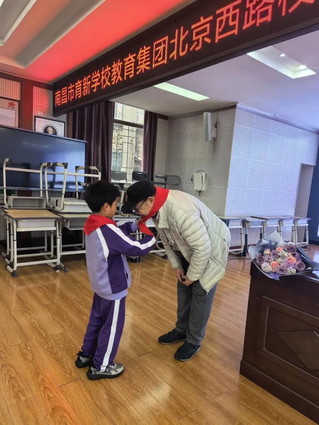 党员教师献花,少先队员代表为刘鲁民先生佩戴红领巾。
