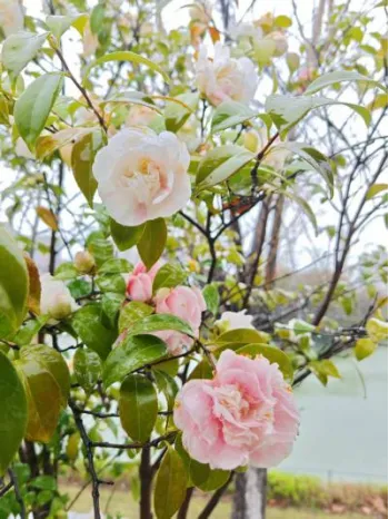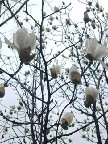 玉兰与山茶在雨中摇曳,