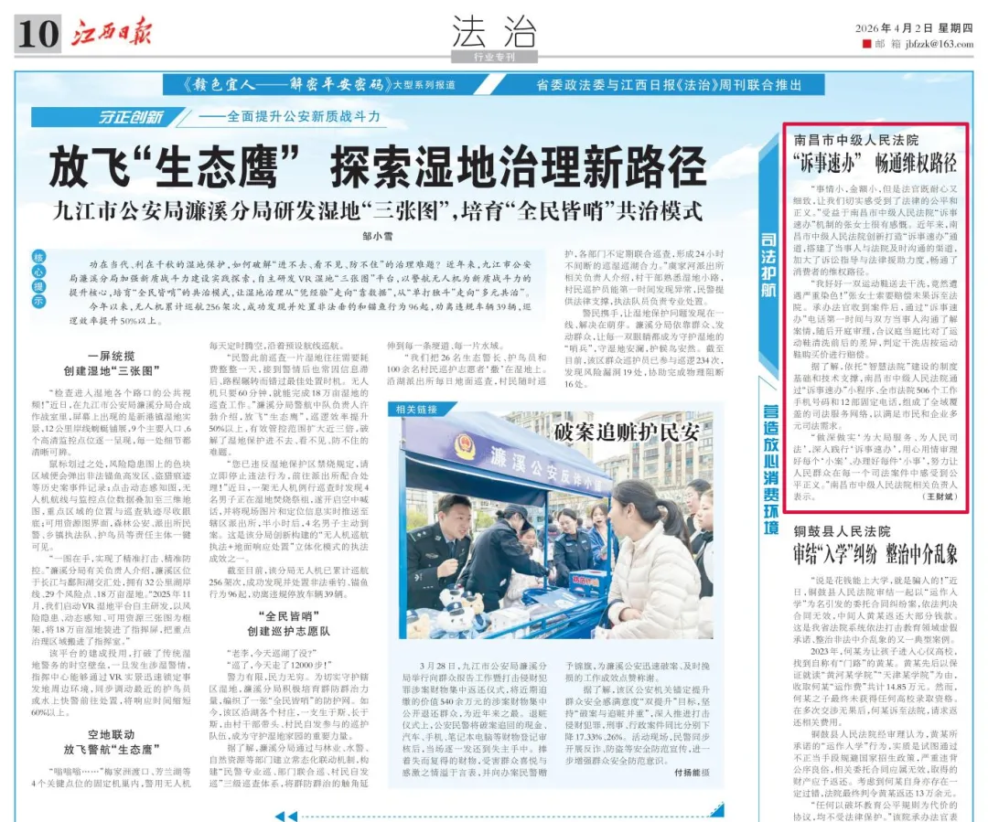 “事情小,金额小,但是法官既耐心又细致,让我们切实感受到了法律的公平和正义。”受益于南昌市中级人民法院“诉事速办”机制的张女士很有感慨。近年来,南昌市中级人民法院创新打造“诉事速办”通道,搭建了当事人与法院及时沟通的渠道,加大了诉讼指导与法律援助力度,畅通了消费者的维权路径。