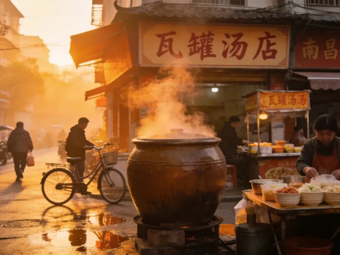 清晨的南昌街头,总能闻到一股醇厚温润的香气——那是瓦罐汤在咕嘟作响。对南昌人来说,一碗热汤不仅仅是早餐,更是刻进骨子里的生活记忆,是这座城市的灵魂味道。清晨南昌街头的瓦罐汤店,热气腾腾的瓦缸,温暖晨光照射南昌瓦罐汤,又称煨汤,源于北宋嘉佑年间,距今已有千年历史。2017年,南昌瓦罐煨汤制作技艺被列入江西省非物质文化遗产代表性项目。唐朝《瓦罐煨汤记》中曾这样记载:"瓦罐香沸,四方飘逸,一罐煨盅,天下奇香。"这句赞誉,印证了瓦罐汤千年传承的品质底蕴。相传北宋年间,一位洪州才子与友人郊游,将剩余鸡鱼肉装入瓦罐,封严后埋入未熄的灰炉中。次日启罐,香气四溢,滋味绝佳。这一偶然发现,成就了流传千年的煨汤技艺。正宗南昌瓦罐汤的精髓,全在一个"煨"字。核心工艺四步曲:🥘严选食材——肉类选用凌晨现宰的三肥七瘦肉,海鲜、菌菇必须当日新鲜,干货精选上乘品质🔥精准装罐——食材放入陶土小瓦罐,加入天然矿泉水,罐口用锡纸密封严实⏰瓦缸恒温——百余个小瓦罐整齐置入巨型瓦缸,硬质木炭火六面体受热✨慢火煨制——先大火160℃煨2-3小时,再中火120℃煨2小时,最后微火保持"冒鱼眼小泡泡"状态,全程7-8小时老饕秘笈:老瓦罐经过常年使用,表面会形成一层油润光泽,煨出的汤口感更具层次。这,就是时间的味道。刚揭开锡纸的鸡蛋肉饼汤,清澈透亮的汤汁,紧实的肉饼,嫩滑的鸡蛋一图展现南昌瓦罐汤从食材准备到慢火煨制的全过程,感受千年匠心工艺南昌瓦罐汤品类多达数百种,形成"经典款+创新款+养生款"的完整风味矩阵:🍲经典款(入门必尝):- 鸡蛋肉饼汤——鲜肉泥搭配鸡蛋,蒸至定型后慢煨,肉质细嫩、蛋香浓郁- 香菇肉饼汤——菌香与肉香完美融合,鲜味更上一层🌿养生款(滋补首选):- 天麻乳鸽汤——秋冬进补,天麻清香与乳鸽鲜嫩结合🌟创新款(年轻之选):- 墨鱼干贝汤——海鲜风味,墨鱼干咸鲜中和肉的厚重这对"黄金CP"堪称江西美食界的经典:- 瓦罐汤:醇厚温润,汤汁鲜香浓郁- 南昌拌粉:鲜辣劲道,香爽有嚼劲一口热汤驱散寒意,一口拌粉唤醒味蕾。这种"一浓一淡、一润一劲"的完美组合,早已成为南昌人刻在骨子里的快乐源泉。如何选到正宗瓦罐汤:✓ 认准老字号——开店3年以上的街边老店,炭火煨汤手艺更纯熟✓ 听声音——推门入店,若能听到瓦缸里此起彼伏的"咕嘟声",那就是对的味道✓ 看瓦缸——店中央必有一口一人多高的巨型陶土瓦缸,这是煨汤的灵魂喝汤小技巧:1. 刚端上桌的瓦罐温度极高,先小口喝汤,避免烫伤南昌瓦罐汤的魅力,从不是靠华丽的包装,而是藏在巨型瓦缸的咕嘟声里,藏在慢火煨出的鲜醇汤汁里,藏在朴实无华的市井烟火里。它是清晨的第一份温暖,是忙碌午后的片刻惬意,是异乡游子念念不忘的乡愁。一罐瓦罐汤,煨热一座城的烟火寻常。你喝过正宗江西瓦罐汤吗?最爱喝哪一款口味?欢迎在评论区分享你的瓦罐汤点赞👍 | 在看👀 | 分享📤让更多人了解江西味道,品味南昌瓦罐汤的独特魅力享尽江西好物 就来师岸甄选