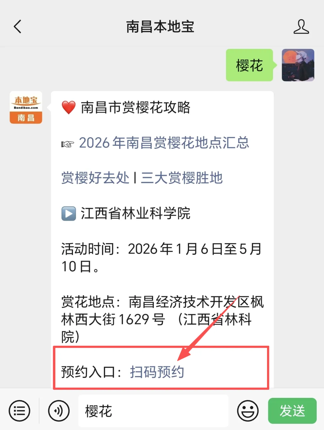温馨提醒:大家可长按识别下方二维码,进入【南昌本地宝】公众号,在后台聊天对话框点击发消息,发送【樱花】即可直接获取江西林科院赏樱预约入口、赏樱信息交流群、赏花攻略