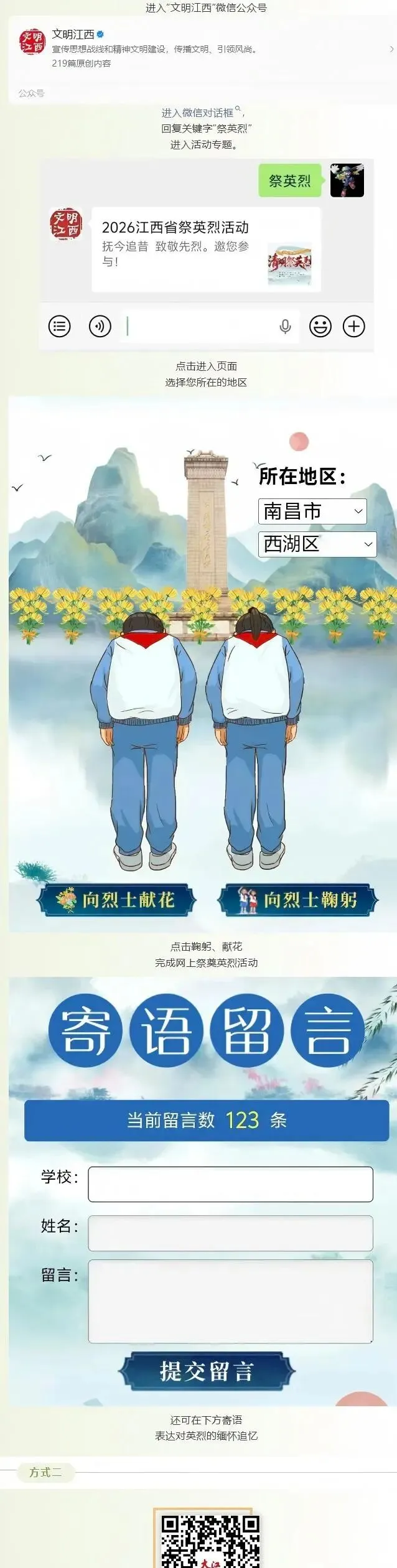 2. 参与方式:登录“文明江西”微信公众号,进入微信对话框,回复“祭英烈”,进入活动专题,选择南昌市-西湖区,点击“鞠躬”“献花”,撰写留言寄语。