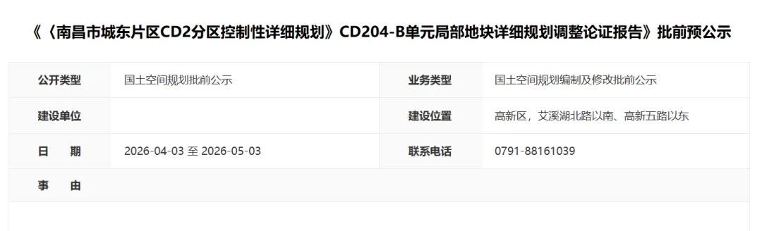 近日,南昌自然资源局发布了多个区域的地块调整,信息量很大,涉及高新艾北板块、青山湖西岸、青云谱洪都新城以及西湖区坛子口老城,涉及了学校、住宅、商业等多个地块,总之变动很大!高新艾北又将有艾三学区房供应,青山湖西岸将迎来临湖低密住宅,老城区又要有低密小地块住宅,青云谱的学校位置也迎来变化!南昌市城东片区CD2分区控制性详细规划》CD204-B单元局部地块详细规划调整论证报告》批前预公示,项目位于高新区,艾溪湖北路以南、高新五路以东