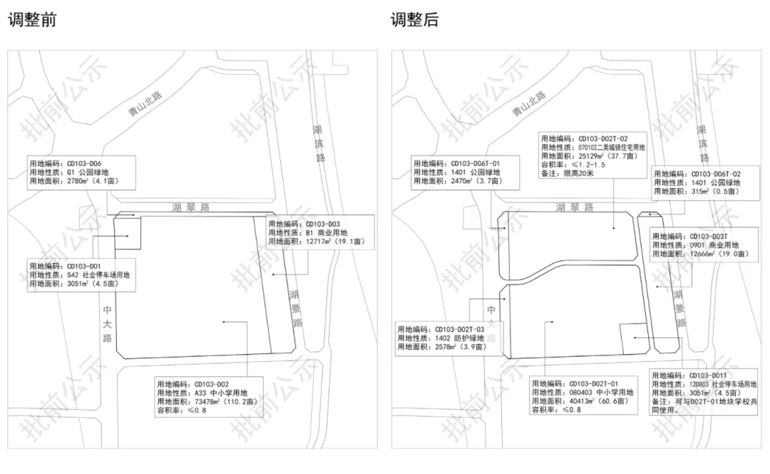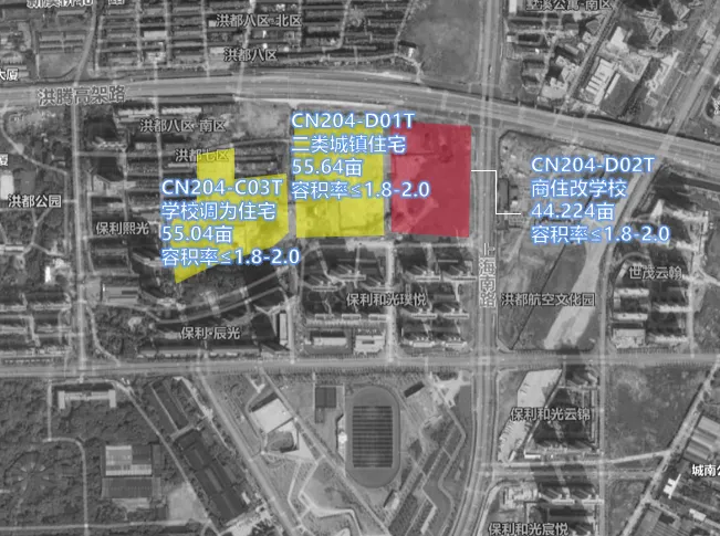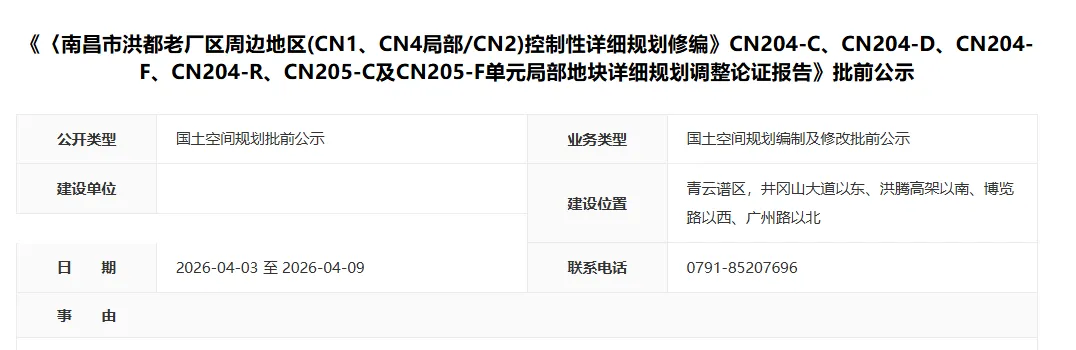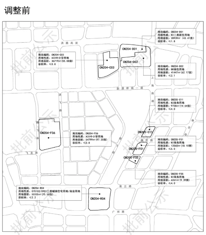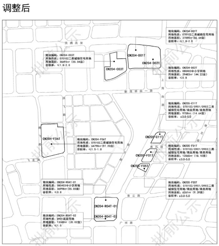 从《〈南昌市青山湖西岸地区控制性详细规划调整(2018)〉》CD103-D单元局部地块详细规划调整论证报告》批前公示公示显示,该地块位于青山湖西岸中骏世界城商业西面,将整个中小学用地切割开,北面的地块调整为住宅用地,用地面积37.7亩,容积率≤1.2-1.5,限高20米。这意味着青山湖西岸将迎来纯洋房或是低密墅区,改善们又可以等等了……地块位置还是蛮好的,距离七里站很近,而且距离青山湖也很近。只不过中骏世界城的商业目前这个情形,稍微影响观感。社会停车场用地改为防护绿地,东面的商业用地切割为一部分的公园用地,东南角调整为停车场用地。近日,南昌自然资源局发布了《南昌市洪都老厂区周边地区(CN1、CN4局部/CN2)控制性详细规划修编》CN204-C、CN204-D、CN204-F、CN204-R、CN205-C及CN205-F单元局部地块详细规划调整论证报告》批前公示》。此次调整的变化很多,涉及了学校地块、住宅等多宗地块。1、洪腾高架以南、保利璞悦以北的三宗地块,学校用地和住宅用地进行了调换,地块大小微调,地块形状更加规整。地块编码CN204-C03(中小学用地,用地面积55.08亩,容积率≤0.8)调整为二类城镇住宅用地,用地面积55.04亩,容积率≤1.8-2.0地块编码CN204-D01(二类居住用地,用地面积43.41亩,容积率≤1.8),地块形状进行了调整,面积变大且更为方正,调整为二类住宅用地,用地面积55.64亩,容积率≤1.8-2.0地块编码CN204-D02(商住用地,用地面积62.17亩,容积率≤2.1)调整为中小学用地,用地面积44.22亩,容积率≤0.8。2、洪都公园东侧的3宗商务用地,都改为二类住宅用地/商业用地/商务用地,容积率统一调整为≤3.0-5.0。之前的振飞学校所在地与青云谱区政府东面地块对调,振飞学校改住宅用地,区政府东面地块改学校用地。地块编码CN204-F06T(中小学用地,用地面积97.2亩,容积率≤0.8)调整为二类城镇住宅用地,用地面积约97.2亩,容积率≤1.5-1.8。地块编码CN204-R04(二类住宅/商业用地,用地面积75.50亩,容积率≤2.2)调整为中小学用地(用地面积55.05亩,容积率≤0.8)+商业用地(20.02亩,容积率≤1.5)。南昌市旧城区JC505单元(绳金塔周边地区)城市设计及控规修编>JC505-NO1、N02、MO8地块详细规划调整论证报告》批前公示,地块位于西湖区东坛街以北,窑湾南路以西