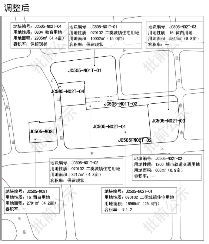 公示显示,将JC505-N02中小学用地进行分割,其中一块位置改为住宅用地。其中局部JC505-N02T-04教育用地,为现状保留;而其余部分调整为JC505-N02T-01二类城镇住宅用地,面积约25.4亩,容积率1.2;JC505-NO2T-02城市轨道交通用地,以及JC505-N02T-03留白用地。此外,JC505-M080702城镇社区服务设施用地调整为JC505-M08T留白用地。这意味着坛子口又有住宅供应了,而且是容积率1.2的低密住宅。我们已经创建了40多个讨论群,想要加入我们的楼市讨论群的,可以加我们的【群助理】进群。