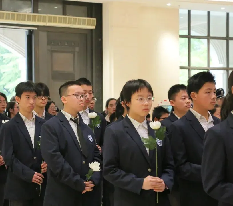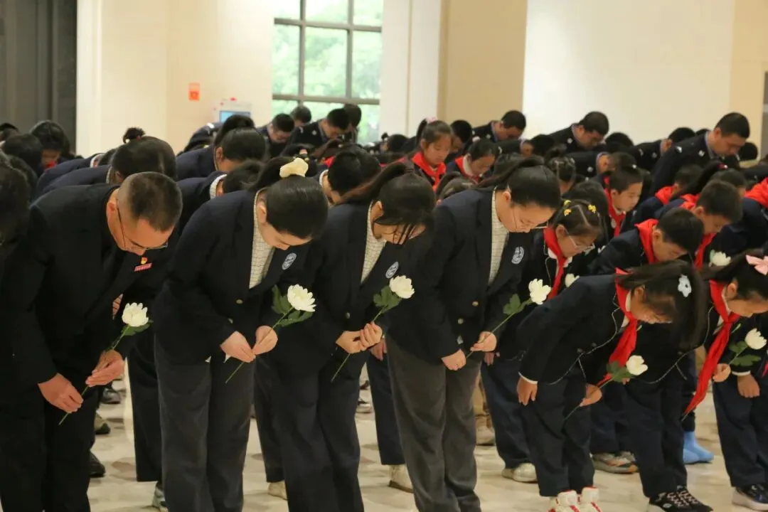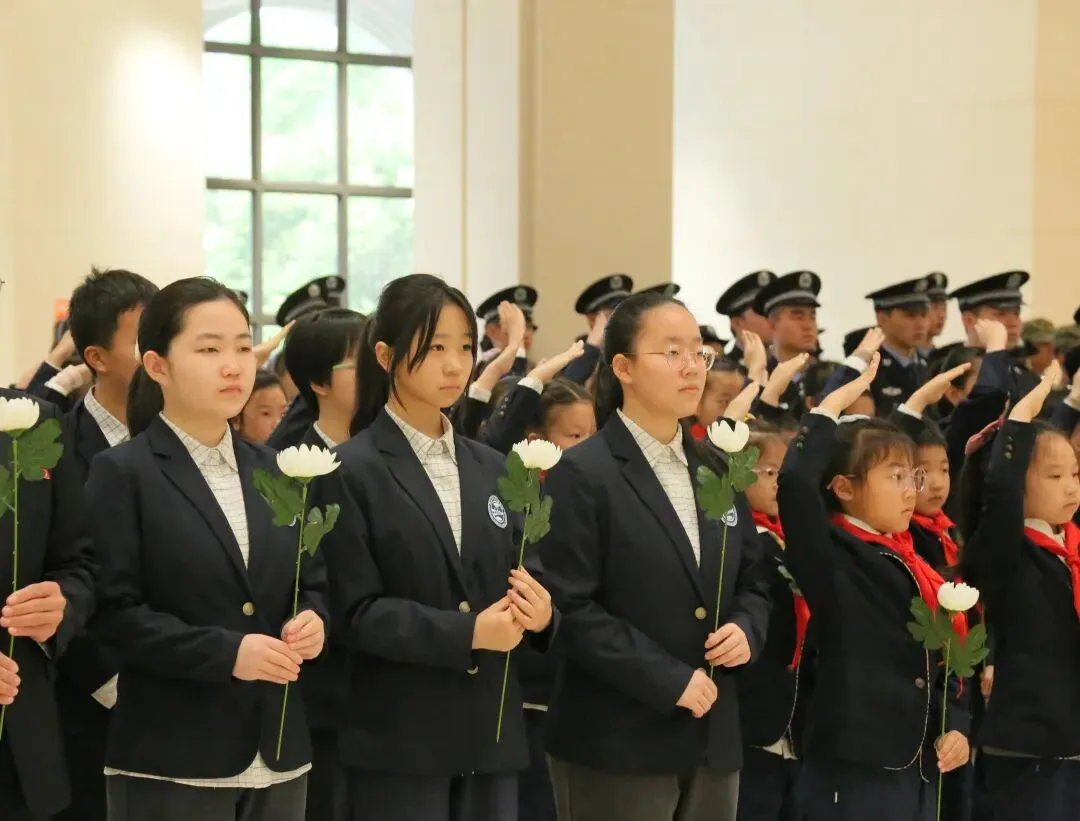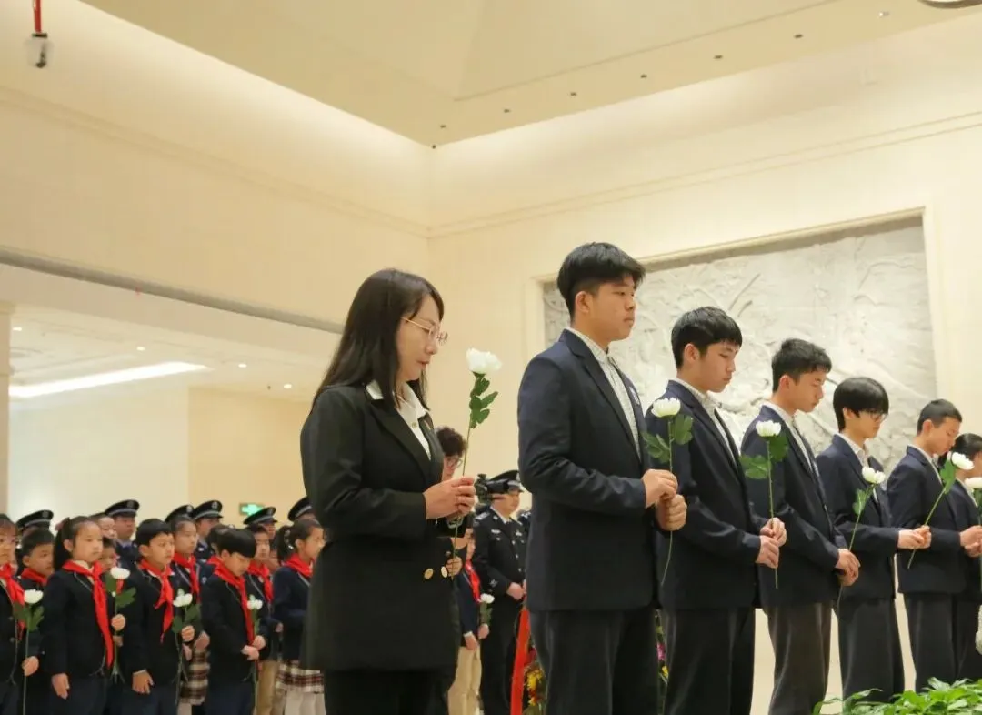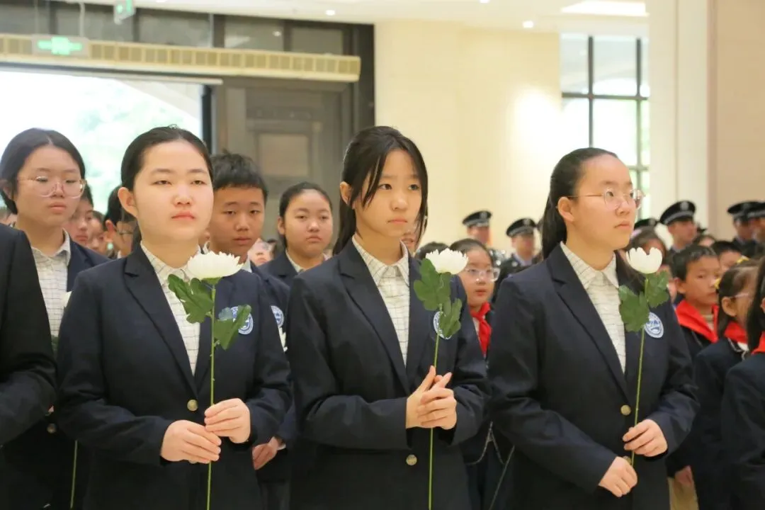 南外学子手持鲜花,依次走向纪念区域,轻轻将鲜花摆放在纪念碑前。一朵朵素洁的菊花,承载着孩子们对英烈的无限追思;一个个庄严的队礼,诉说着新时代青少年对英雄的崇高敬意。