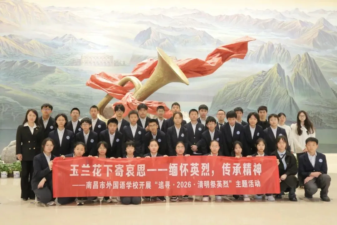 2026年4月3日上午,南昌市外国语学校30名学生代表及教工团支部团员,在初中工作分管校长杨颐琴的带领下,怀着无比崇敬的心情,走进南昌新四军军部旧址陈列馆,参加“玉兰花下的哀思”集中祭扫活动,以一场庄严的仪式,追寻红色足迹,缅怀革命先烈。