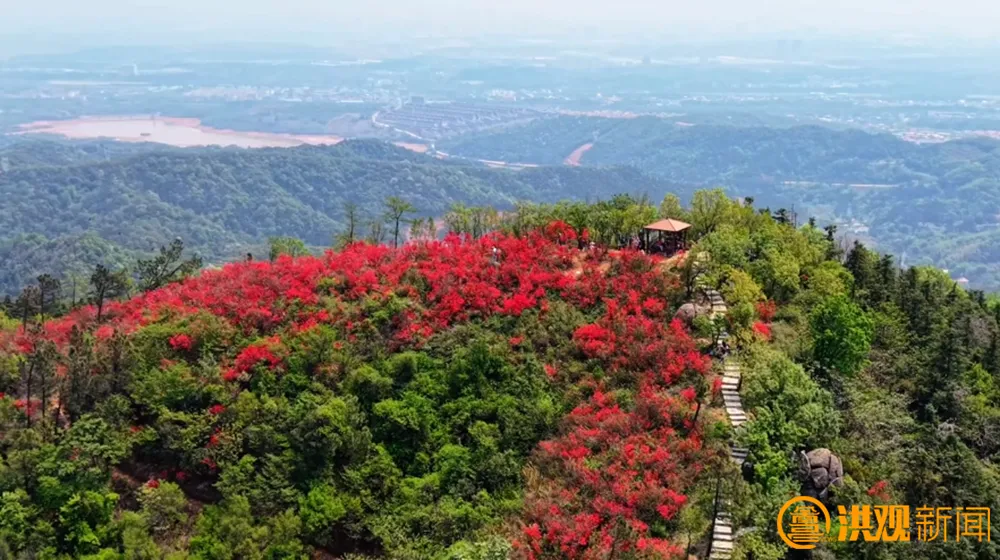 南昌经开区蛟桥街道上风景村塔下自然村,藏着一处免费登山赏花秘境——1万多株野生杜鹃正热烈绽放,兼具登山乐趣与赏花美景,成为市民周末短途出行的首选,从南昌市区自驾前往此处约35分钟可达。记者沿凤鸣凰登山步道拾级而上,步道依山而建、蜿蜒曲折,沿途草木葱郁、空气清新,步行约半小时,便闯入一片火红花海。只见杜鹃沿着山坡层层铺展,一簇簇、一丛丛,与青山绿树相映成趣,每一株都开得饱满艳丽、毫无衰败迹象,登山的疲惫瞬间被这春日盛景消解。
