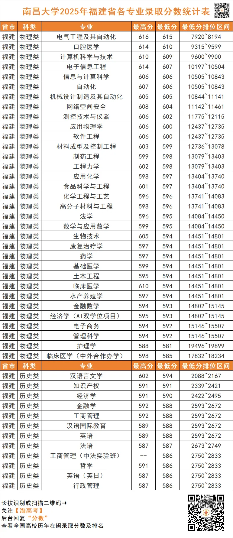 >南昌大学2025年福建省各专业录取分数统计