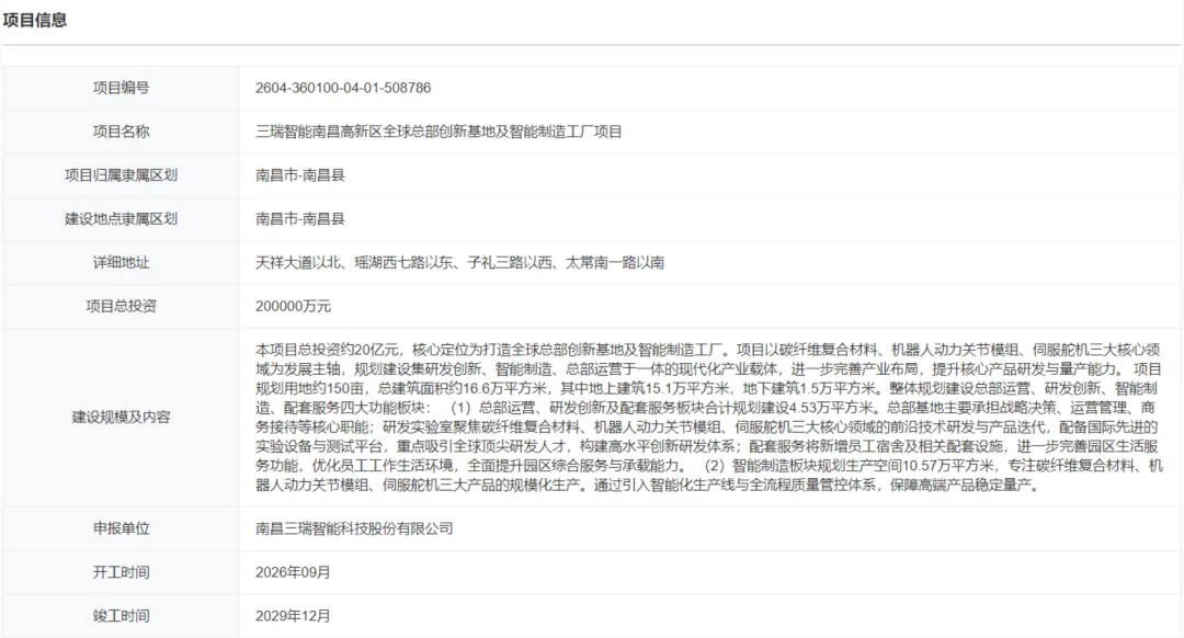 近日,官方平台发布了三瑞智能南昌高新区全球总部创新基地及智能制造工厂项目备案,项目编号2604-360100-04-01-508786。总投资 20 亿元的高端智造项目落址瑶湖板块,为南昌产业版图再添硬核力量!此次落地的产业项目,由南昌本土新晋 A 股上市公司 —— 南昌三瑞智能科技股份有限公司倾力打造,核心定位为全球总部创新基地 + 智能制造工厂,聚焦三大核心赛道布局,将成为南昌高端智造领域的标志性项目。项目选址南昌高新区瑶湖北产业片区,具体位于天祥大道以北、瑶湖西七路以东、子礼三路以西、太常南一路以南,周边汇聚多家科技产业园与生活配套,产业氛围浓厚、区位优势显著。项目规划用地约 150 亩,总建筑面积约 16.6 万m²,其中地上建筑 15.1 万平方米、地下建筑 1.5 万平方米,计划2026 年 9 月开工、2029 年 12 月竣工。项目整体规划建设总部运营、研发创新、智能制造、配套服务四大功能板块,具体规划如下: