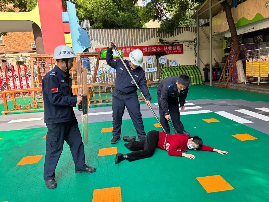 为强化安保力量,提升师幼防暴避险意识,我园邀请公园派出所民警来园开展反恐防暴应急演练。模拟“暴徒”试图闯入校园时,安保人员迅速启动预案,使用防暴钢叉、盾牌等器械成功制服“暴徒”;各班教师第一时间关闭门窗、组织幼儿躲避,全方位提升师幼应对突发暴恐事件的应急反应能力,夯实校园安全防线。