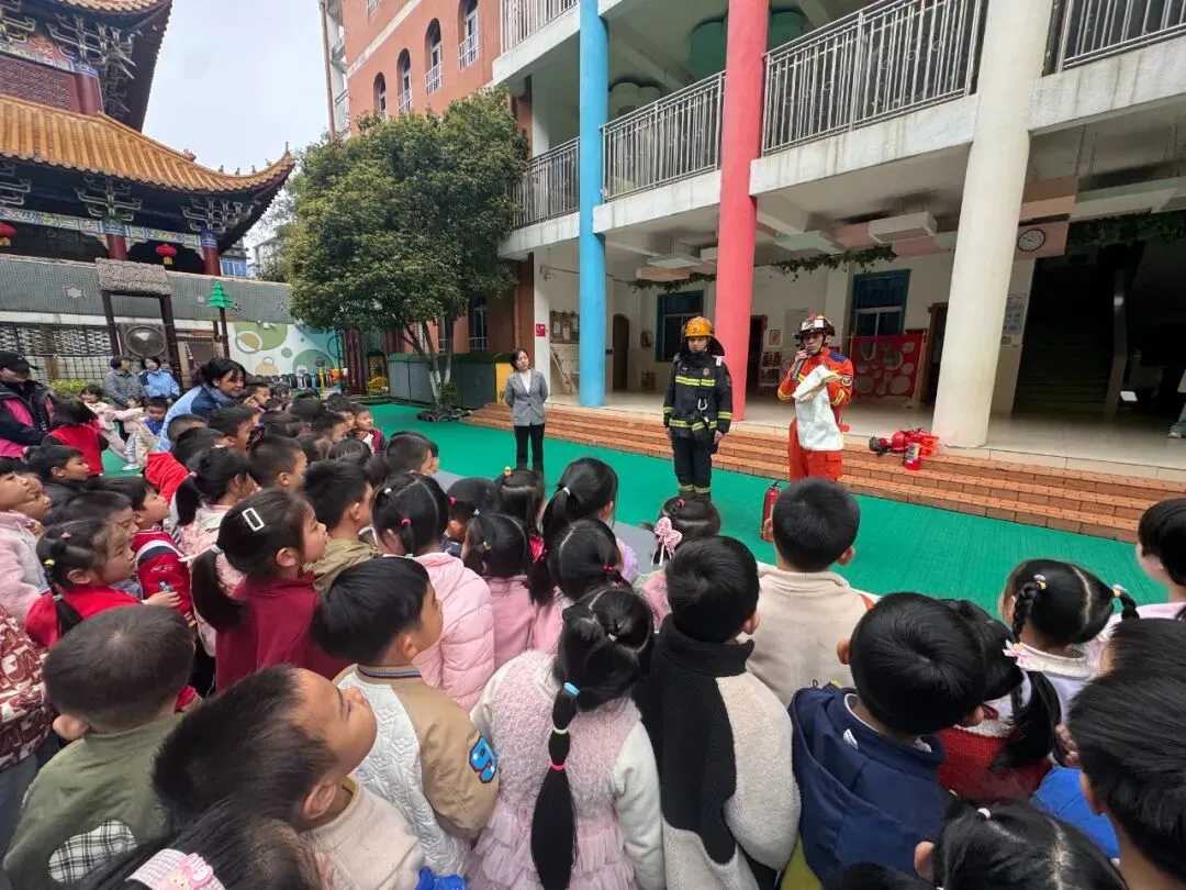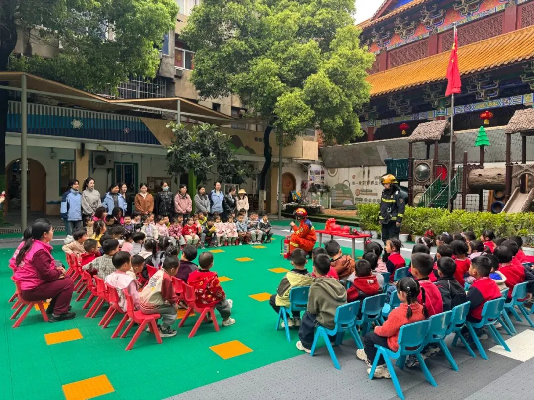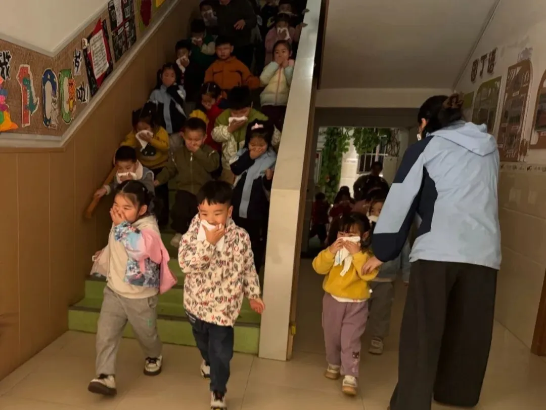 随着警报声响起,消防疏散演练正式启动。各班教师迅速组织幼儿,用湿毛巾捂住口鼻、弯腰低姿,沿预定路线快速、有序撤离到操场安全区域。整个演练紧张有序,师幼配合默契,有效提升了突发火灾的应急处置能力。东湖区消防救援大队人员用童趣化的语言,讲解火灾危害、灭火器使用、火场逃生技巧,现场展示消防装备,让孩子们直观认识消防、敬畏消防。