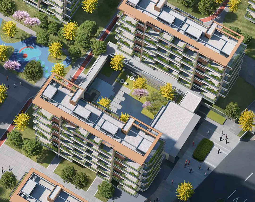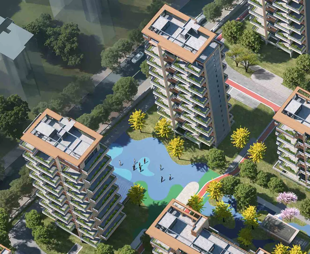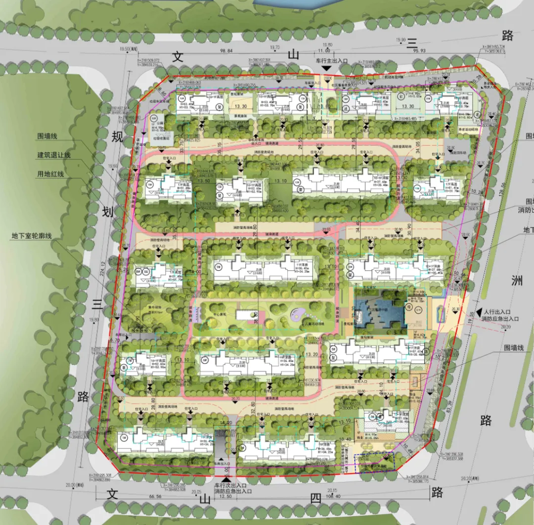 ,其中小高层以17层为主,洋房则以11层为主,东南侧设有沿街商铺。
