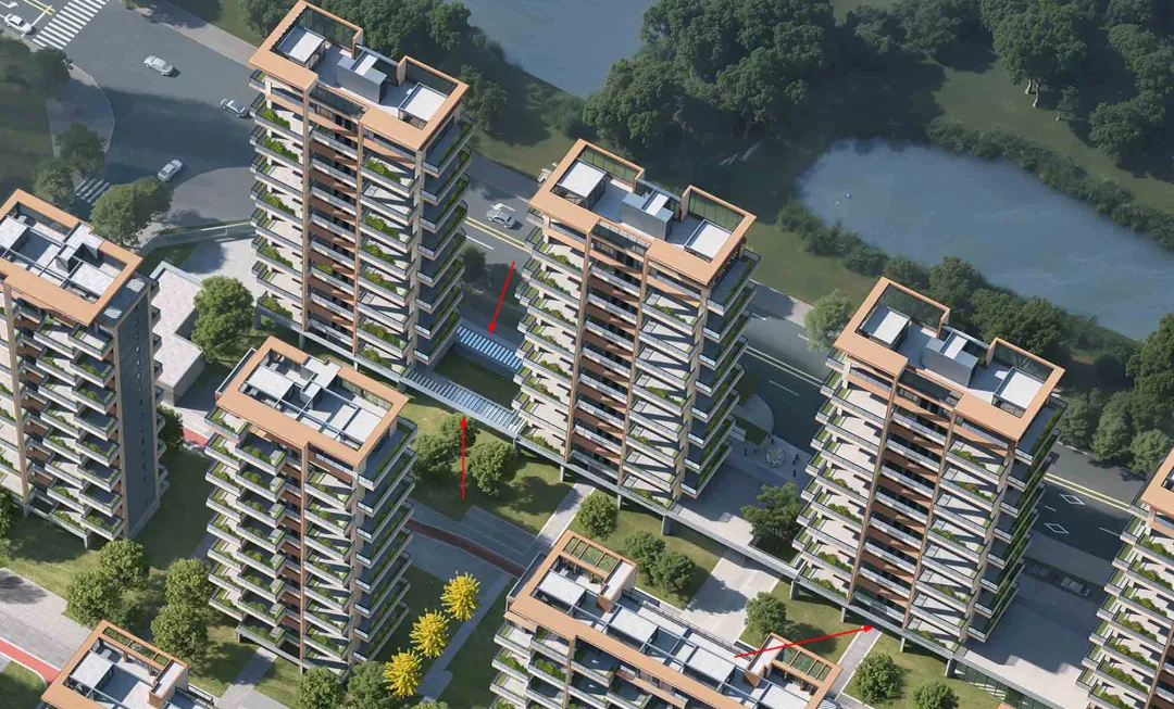 此外,小区北面一排楼的一楼全部为架空,同时上方形成一个类似“抬板”的设计,二楼形成了一个整体的活动面,