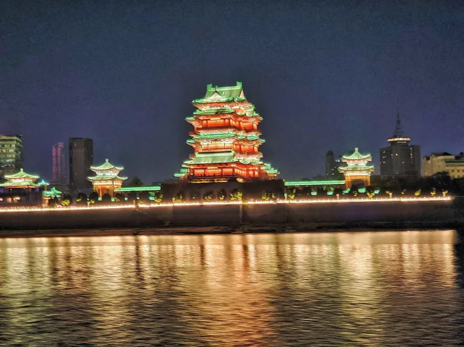 而且,如果你不想花 50 块钱登阁,也完全没关系!你可以去对岸的秋水广场,或者新洲文化广场,晚上的时候,免费就能看到滕王阁的全景灯光秀!那种赣江两岸的灯火,滕王阁的璀璨灯光,比你在里面看还要美!