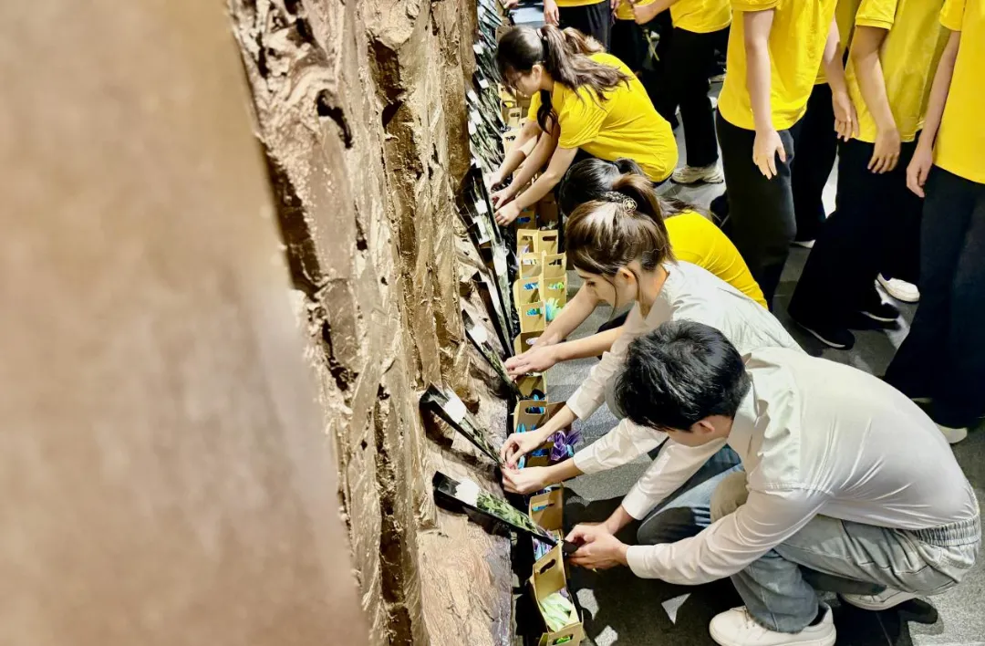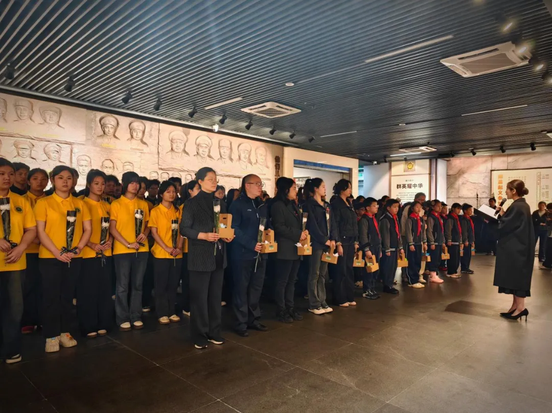伴随着悠扬的小提琴声,孩子们将亲手折叠的纸质玉兰花汇聚成篮,与受邀嘉宾及师生代表共同走向献花区,手捧鲜花与玉兰花篮,依次来到南昌起义参加者名录墙前敬献,以花为语,向英烈致以最诚挚的敬意。