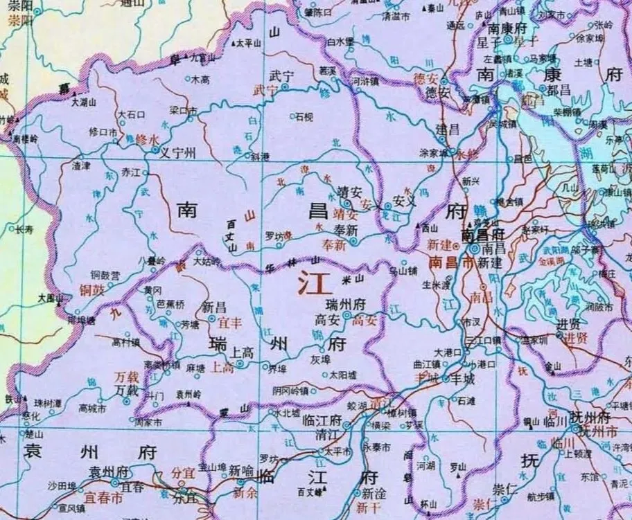 按道理来说,修河流域上游本可自成一府,但却归入南昌府辖下,笔者猜测与其经济体量、人口规模不足有关,需要依托省城的辐射力兼带帮扶。换个更易理解的视角来看,假若宁武奉靖四州县独立成府,修河入鄱湖口的经济重镇吴城划归南康府,两府之于修河的关系就与袁州、临江二府之于袁河如出一辙—— 一者扼守上游山地,一者扼守下游河口交通枢纽。但修河流域并非本文的探讨重点,我们的目光,还是得落回南新丰进这片南昌府的核心腹地,也就是南昌城市发展真正的地缘基本盘。