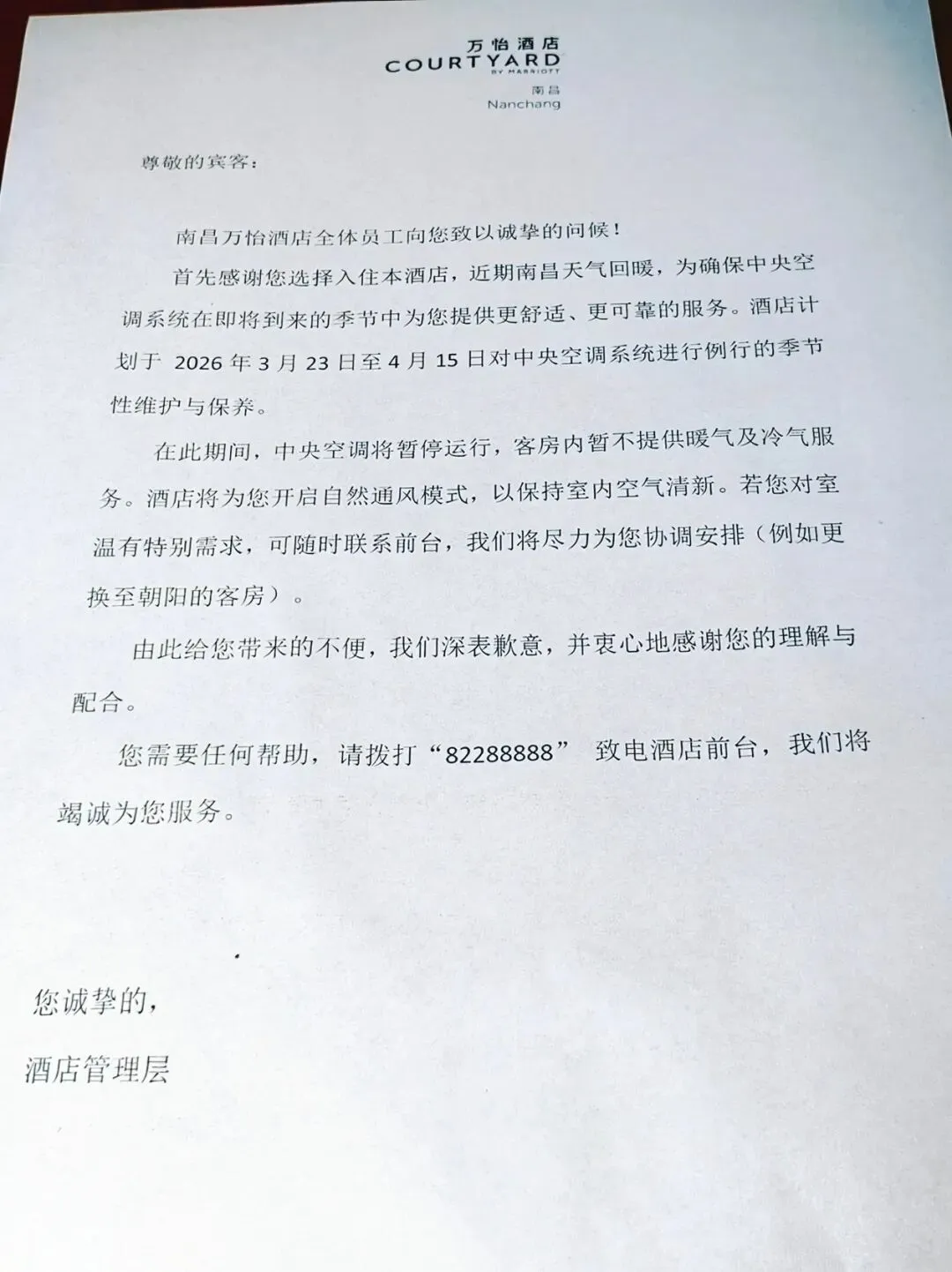 空调:入住时被告知中央空调正在维护,不过3月底的南昌室内温度刚好,开窗通通风也挺舒服,倒也不算什么问题