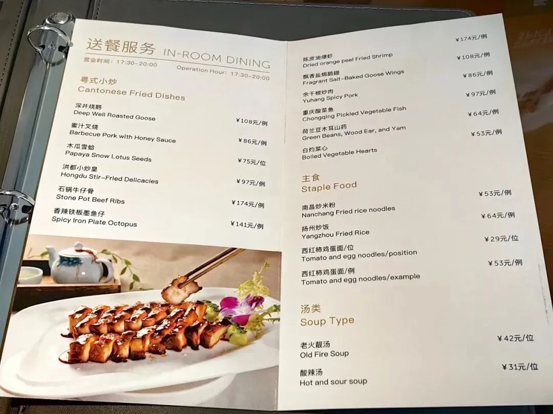 客房送餐:看了一眼菜单,价格不低,主打粤式小炒,性价比一般。不过对于不想出门的客人来说,也算多一个选择,当然也可以直接去豫景轩点餐。