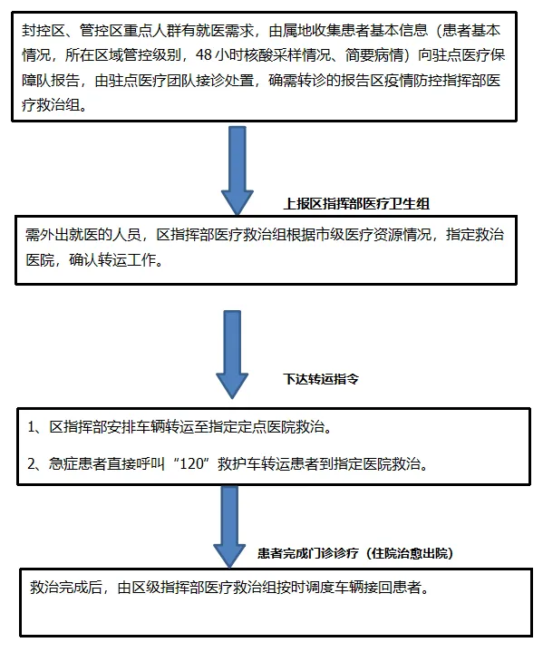 危急重症直接拨打120,进行快速急救。重症患者立即向所在社区或居委会报备,由封控小区转运组安排专车送至市里统一安排的指定医院,落实闭环救治。产检生育、血液透析、肿瘤诊治等特殊患者可通过预约方式,提前向所在社区或居委会报备后,根据需要安排就医。