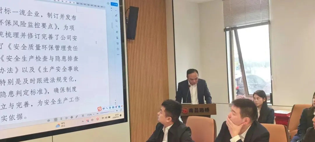 公司副总经理杜宏文作《南昌公路桥梁工程有限公司2025年度安全生产工作总结》。从六个方面进行了总结:一、健全责任体系,强化制度执行,筑牢安全管理根基;二、深化隐患排查,聚焦风险管控,有效防范安全事故;三、加强应急管理,提升处置能力,夯实应急保障基础;四、抓实教育培训,培育安全文化,提升全员安全素养;五、突出重点领域,严控风险环节,确保防控措施到位;六、存在的问题与改进措施。并制定了2026年安全生产工作计划,将重点从体系建设、安全教育培训、风险预防、隐患排查治理、农民工工资发放监管方面开展以下工作:(一)完善标准化管理办法和制度;(二)分层级分类培训;(三)风险辨识与预防;(四)强化民工工资发放监管。