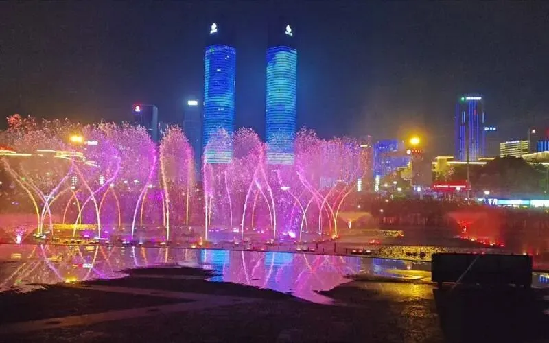 10.秋水广场:秋水广场是位于江西省南昌市红谷滩区赣江中大道的大型休闲广场,与滕王阁隔江相望,其名称源自《滕王阁序》中“落霞与孤鹜齐飞,秋水共长天一色”词句。该广场始建于2003年7月28日,2004年1月28日正式开放,整体呈月牙形布局,岸线长1100米,最宽处110米,总面积约10万平方米。核心景观为音乐喷泉群,主喷高度达128米,曾为亚洲规模最大的音乐喷泉系统。