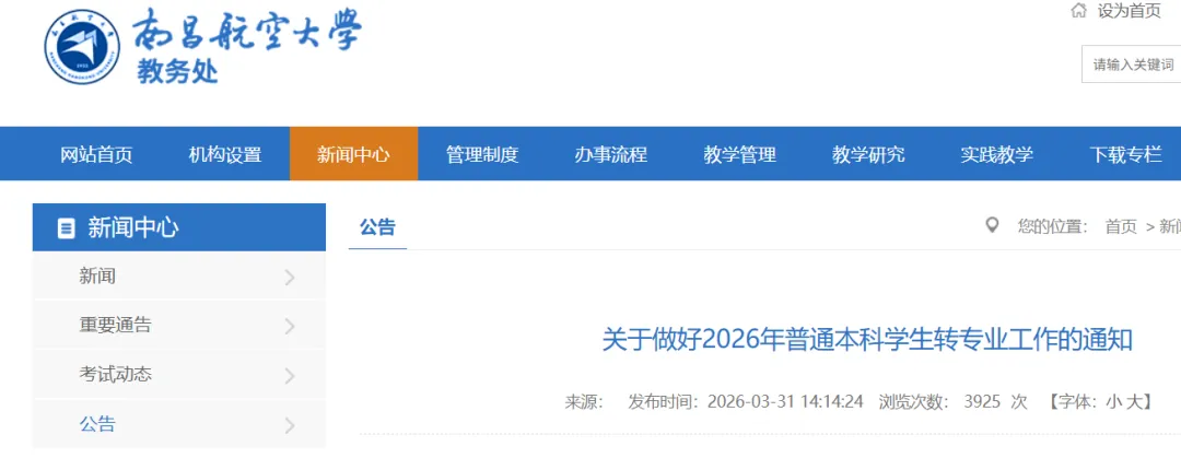 1.教务处发布2026年各学院转专业计划(附件2)。各学院在学院网站发布转专业实施方案,主要内容包括:接收专业、名额计划、报名条件、接收条件、考核内容、考核办法、申请材料等主要内容。