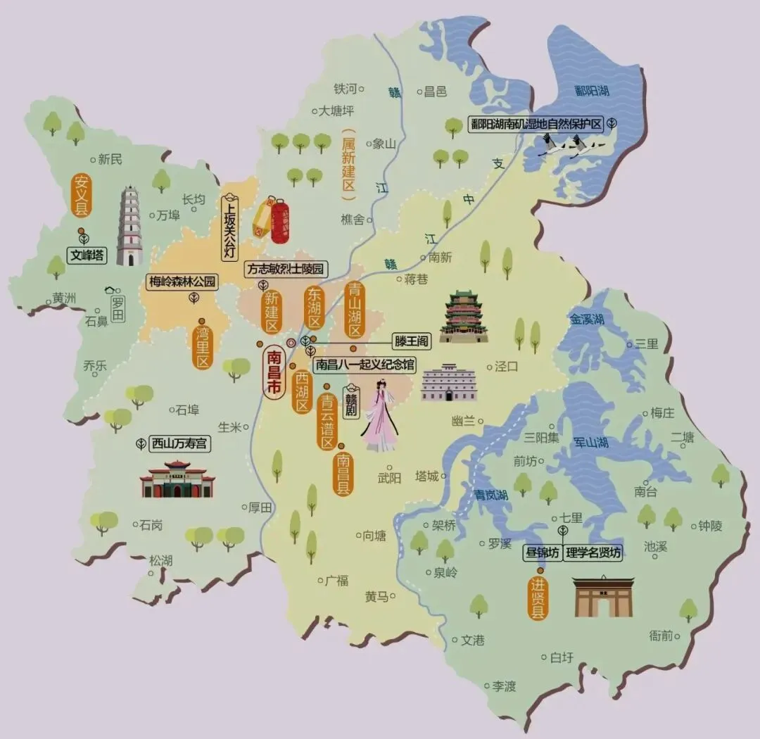 下辖6区:东湖、西湖、青云谱、青山湖、新建、红谷滩,3县:南昌、进贤、安义。
