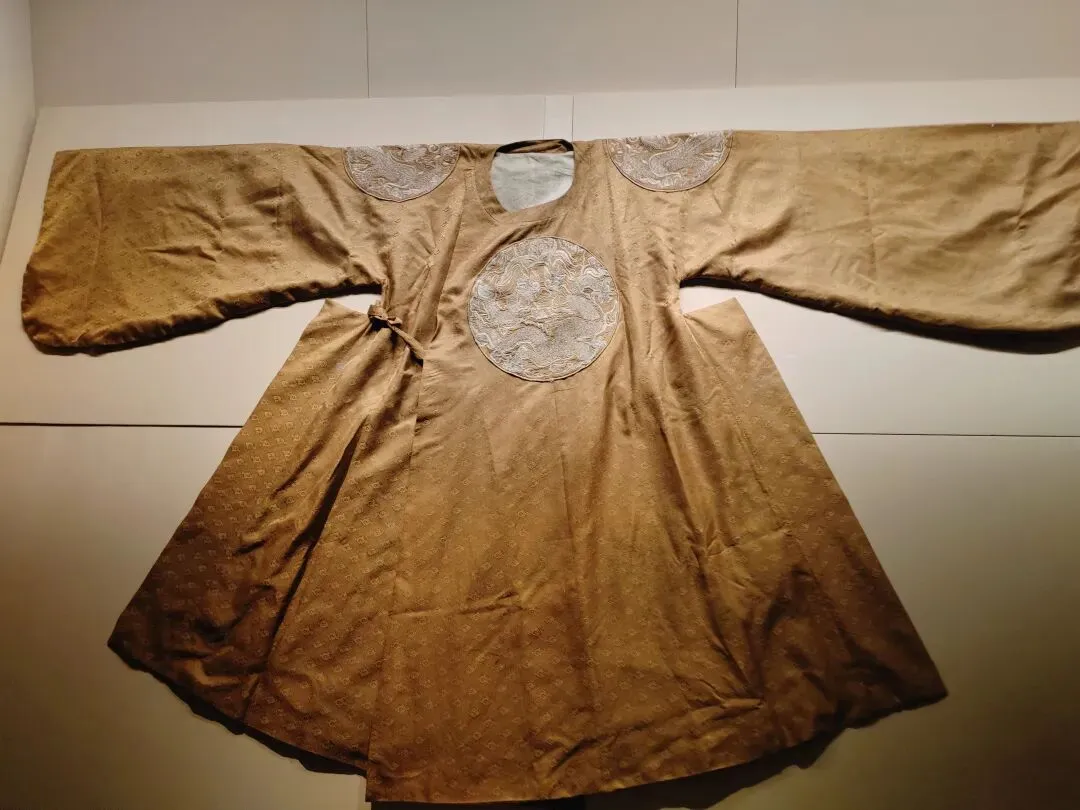 还有一件明代四爪团龙纹黄锦袍,也是国宝级文物。不过因为丝织品极度娇贵,不能长期展出,现在游客看到的是复制品。