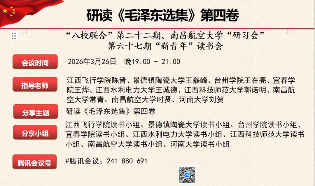 3月26日晚,南昌航空大学“大学生研习会”联合江西飞行学院、景德镇陶瓷大学、台州学院、宜春学院、江西水利电力大学、江西科技师范大学、河南大学等八所高校,以线上形式举办“八校联合”第二十二期暨“新青年”第六十七期读书会,共同研读《毛泽东选集》第四卷。本次读书会由25级研究生彭丽爱主持。