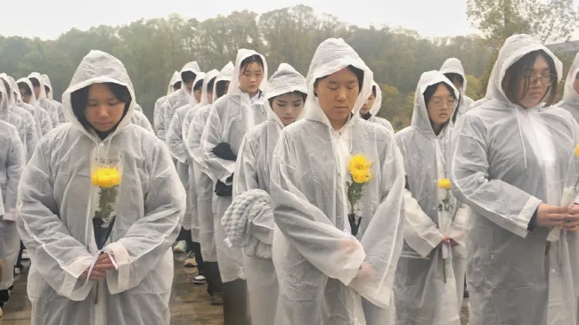 默哀完毕,同学们依次向纪念碑敬献素菊,俯身擦拭烈士墓碑,以庄重之姿、轻柔之举表达对先烈的崇高敬意。全体学生代表整齐列队,面向团旗庄严宣誓,重温入团誓词,铿锵誓言在陵园上空久久回荡。仪式尾声,全体人员向纪念碑行三鞠躬礼,深深鞠躬间饱含无限敬仰与追思。