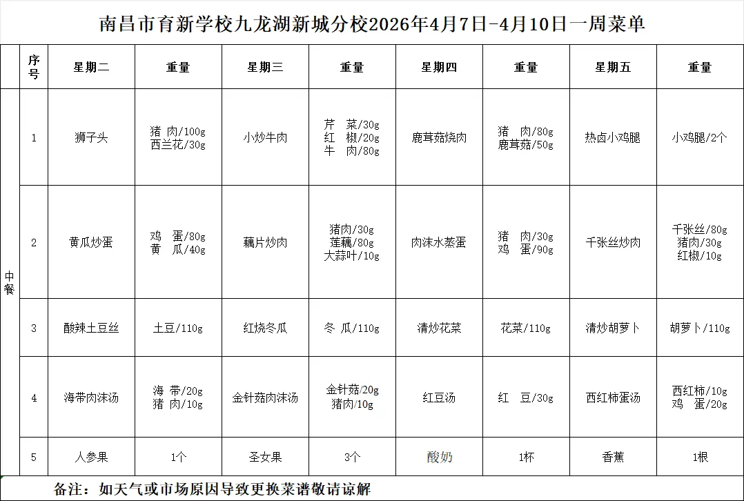 南昌市育新学校九龙湖新城分校2026年4月7日至4月10日一周菜单