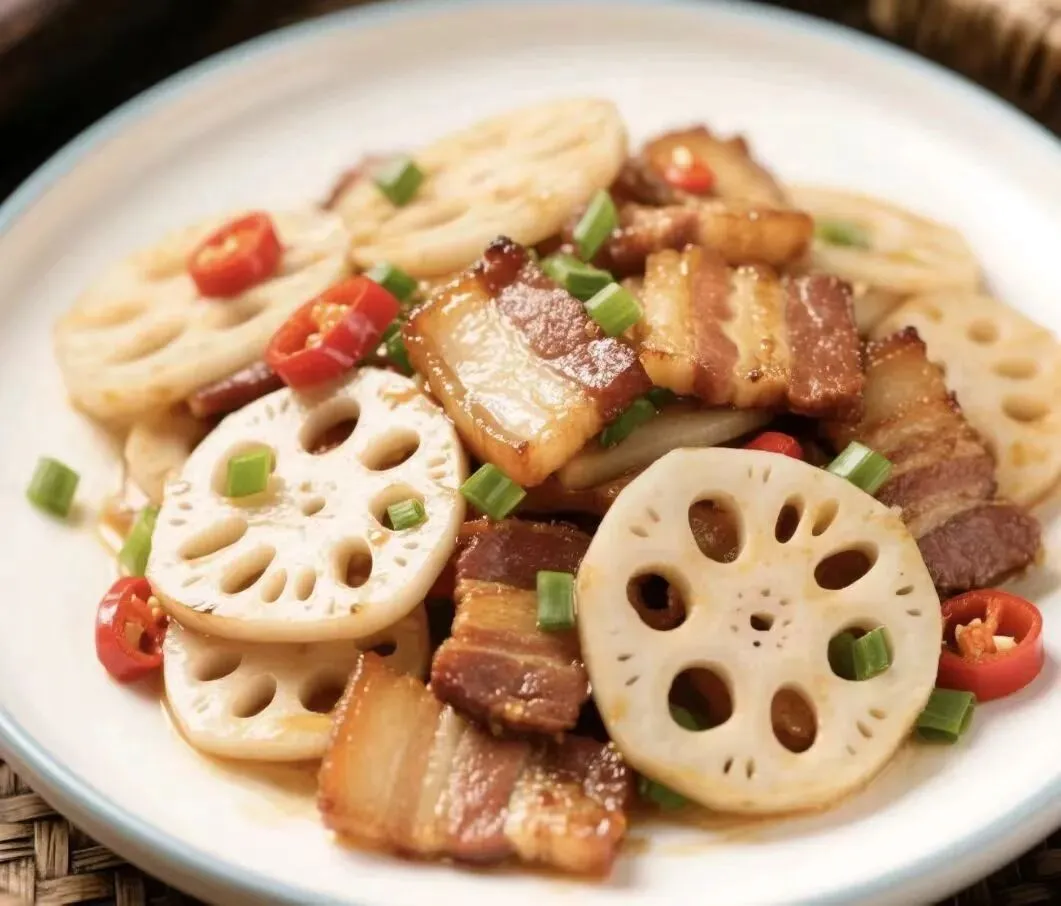 小炒牛肉、藕片炒肉、红烧冬瓜、金针菇肉沫汤、圣女果