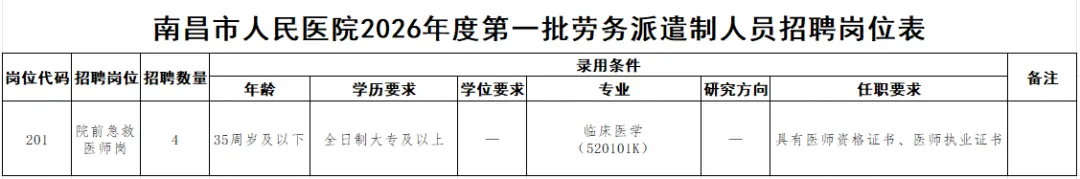 为满足我院经开院区工作需要,南昌市人民医院现面向社会公开招聘4名院前急救医师岗劳务派遣制人员。现将有关事项公告如下: