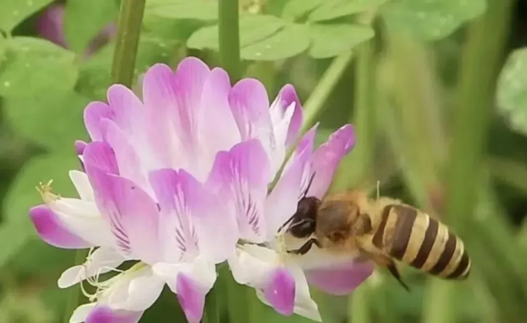 紫云英(Astragalus sinicusL.)是豆科黄芪属植物,跟我们常吃的绿豆、大豆、红豆等是亲戚。它是一种柔弱的小草本,离地面只有10厘米左右,茎软软地趴在地上,一节一节往前爬,叶子是羽状复叶(豆科典型特征),一小片一小片圆圆的,像一串铜钱。我在那里蹲了很久,发现蜜蜂很痴迷它,在它的小紫花上来来回回采着蜜。紫云英是一种优良的蜜源植物,颜色浅,味道清甜,市场上叫做“紫云英蜜”。