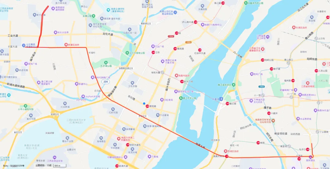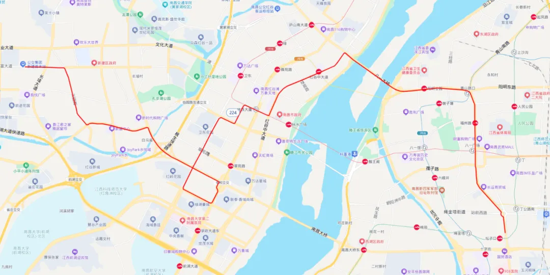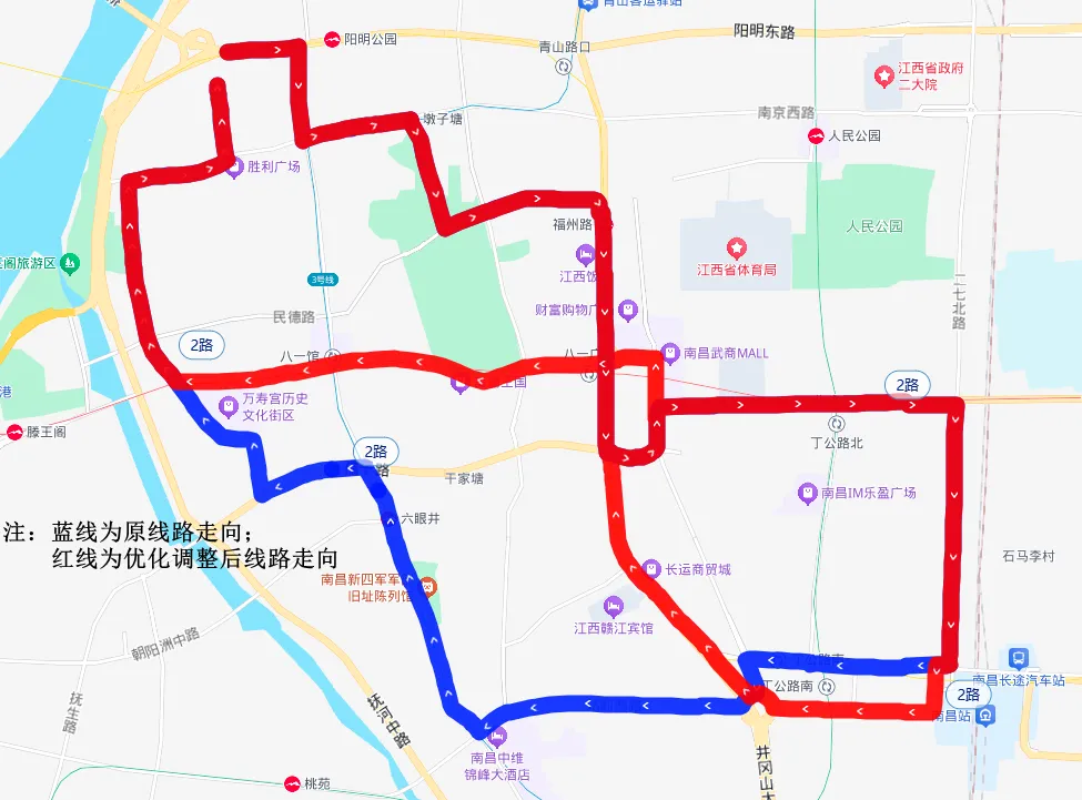 1.调整后线路走向:长富大道—兴国路—长征西路—礼步湖大道—南斯友好路—丰和南大道—岭口路—凤凰南大道—凤凰中大道—怡园路—金融大街—世贸路—红谷中大道—庐山南大道—八一大桥—阳明路—八一大道—井冈山大道;